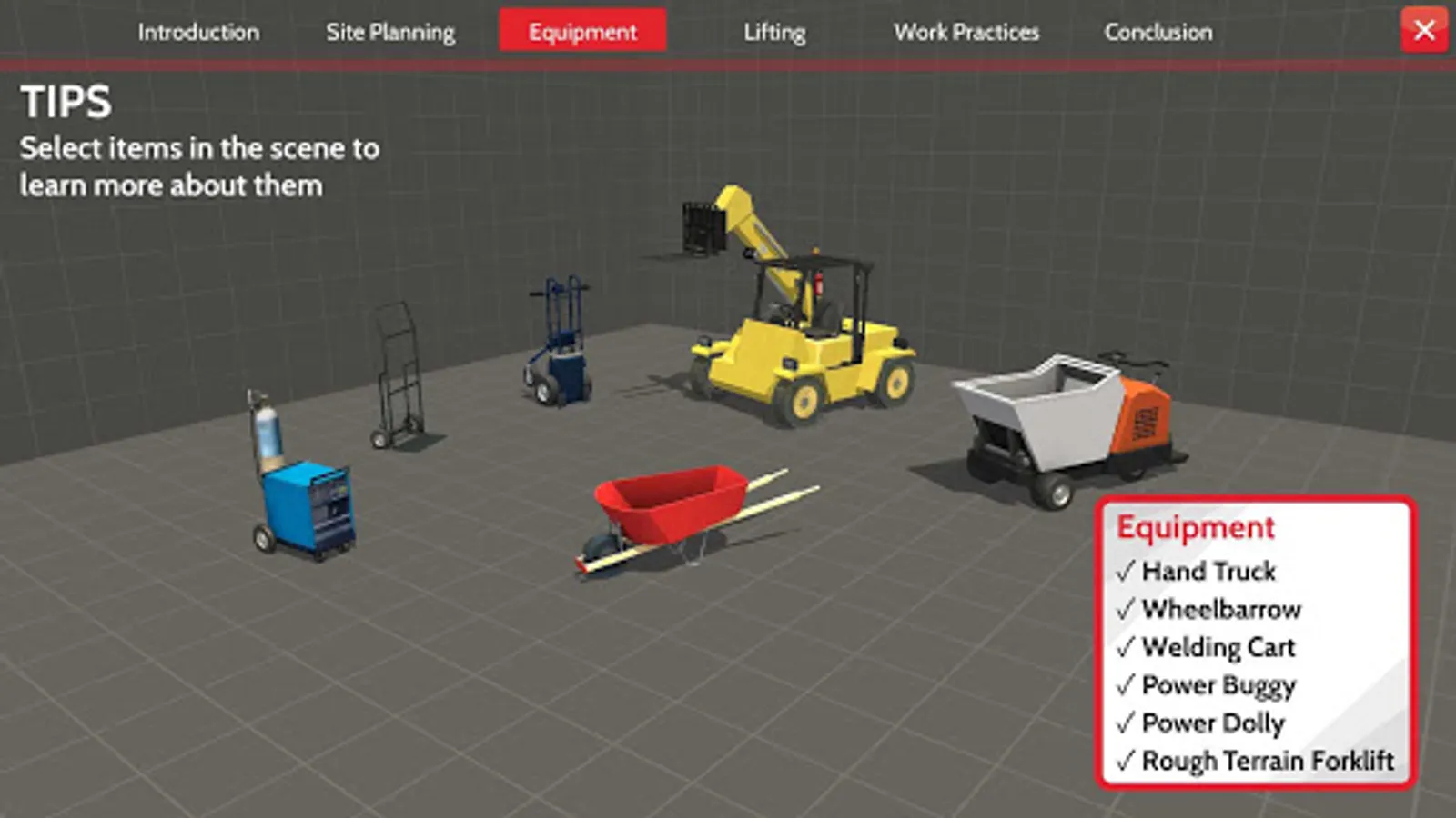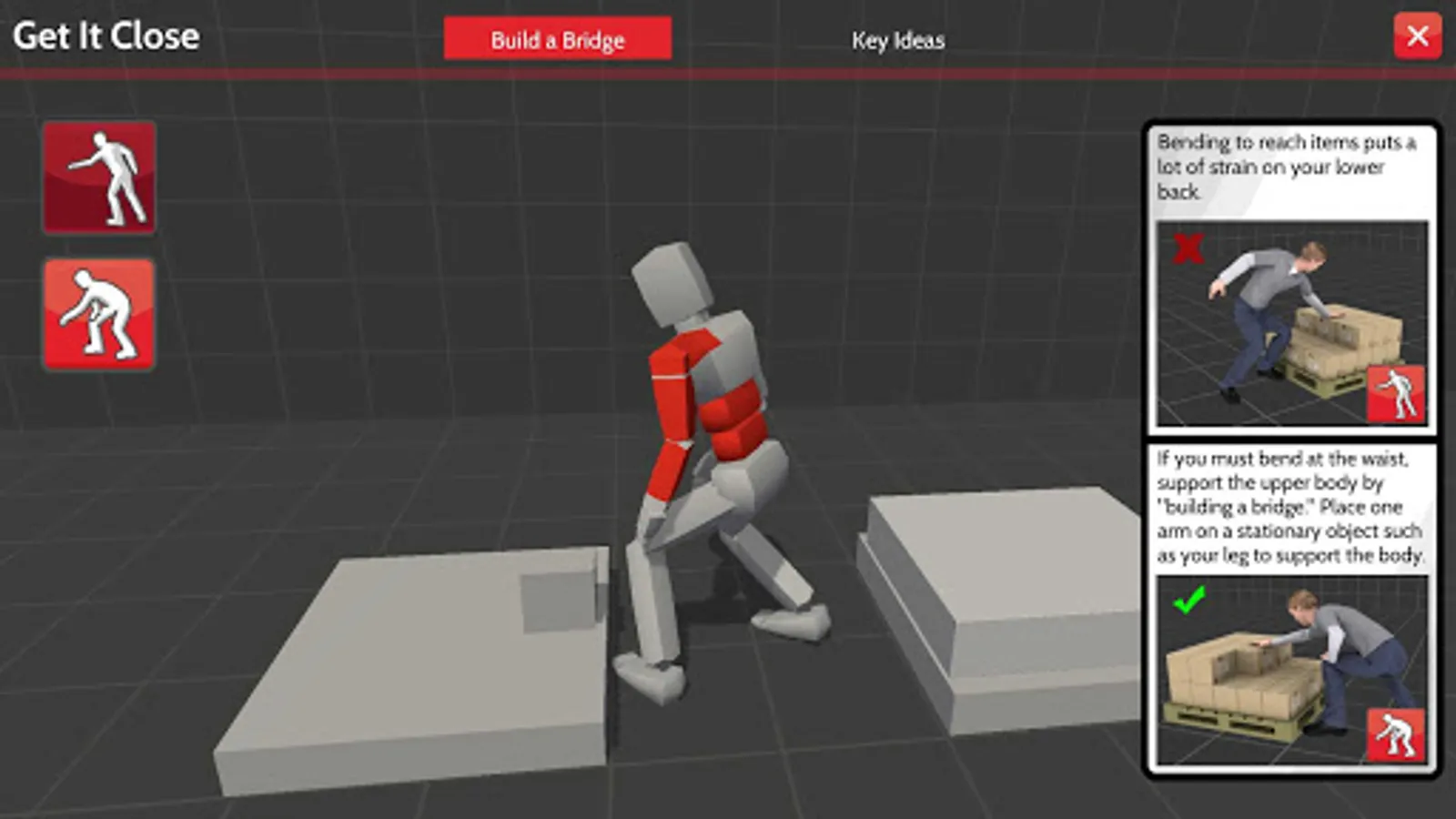 The Site Planning portion of the tool includes questions to consider and resources to help plan for safe materials handling throughout a project’s lifecycle – from preparing the bid through completing the project. It includes information on the benefits of engaging in safe practices, Excel spreadsheets, checklists, and on-site training materials to use during a construction project. The Interactive Training and Coaching sections can be used in a classroom setting or on their own to introduce the importance of planning to minimize manual materials handling, safe lifting practices, and the effects of poor lifting practices. The two Lift Coach games reinforce these practices and take the player through an interactive walkthrough of a worksite and the components that lead to safer manual materials handling.
