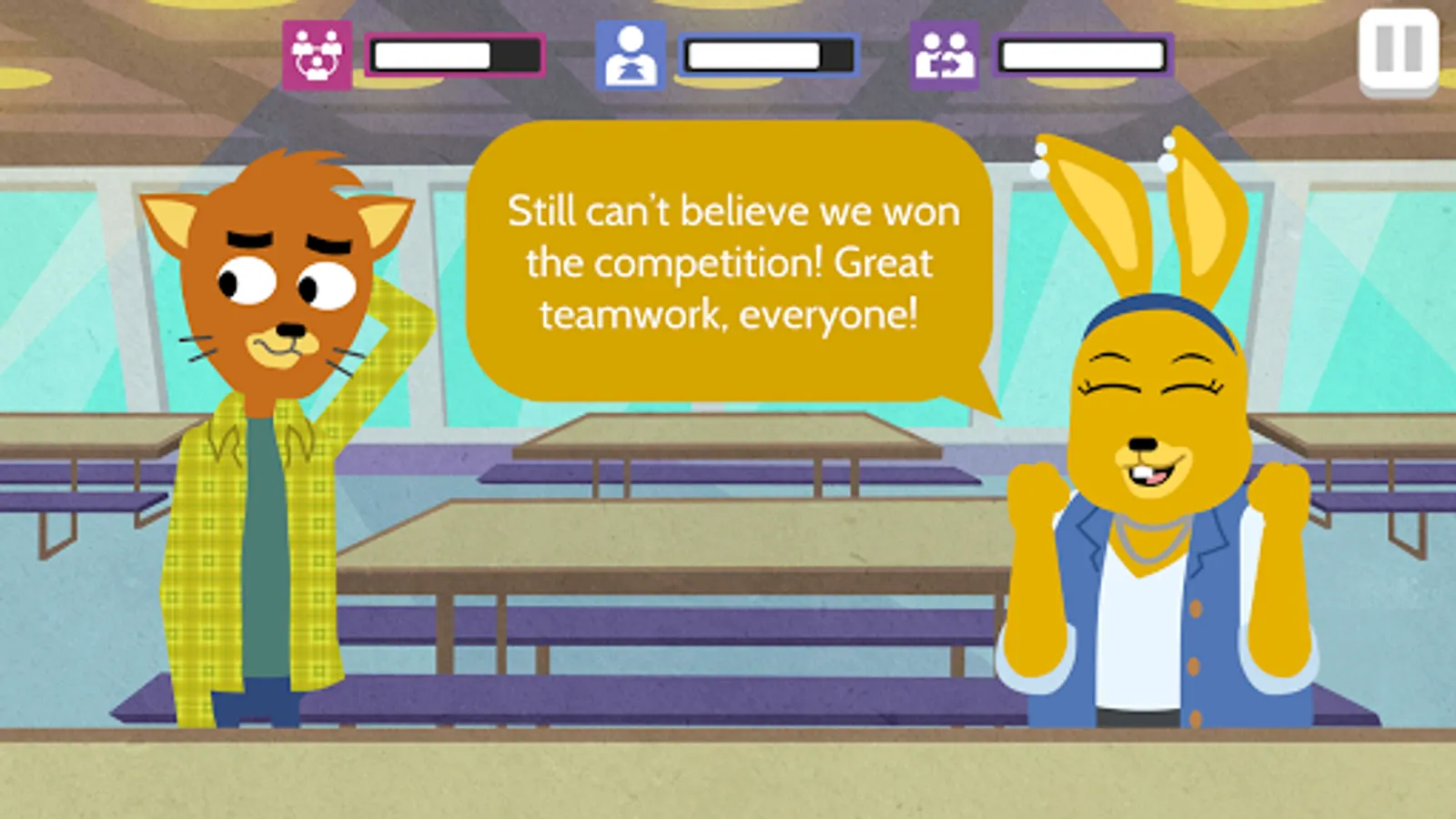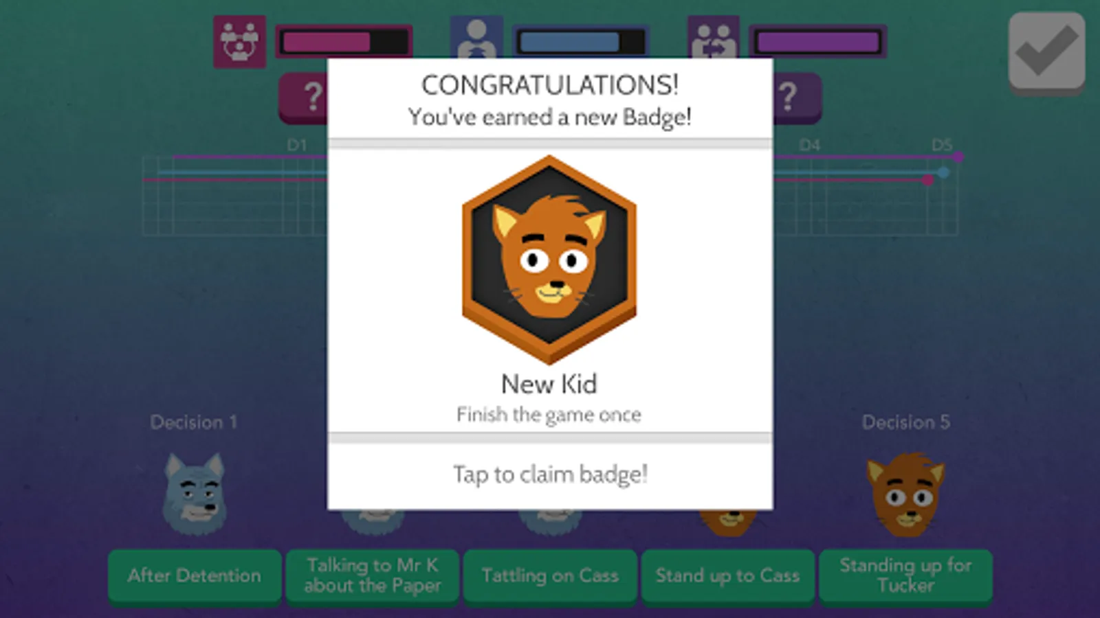 WyldWood Stories centers around dialogue-based interaction. Players participate in a character-driven story made up of a series of conversations, selecting responses at key junctures. The responses represent using (or not using) the key behaviors to varying degrees. At the end of the game, the player receives feedback about their performance, enabling repeat play toward mastery.