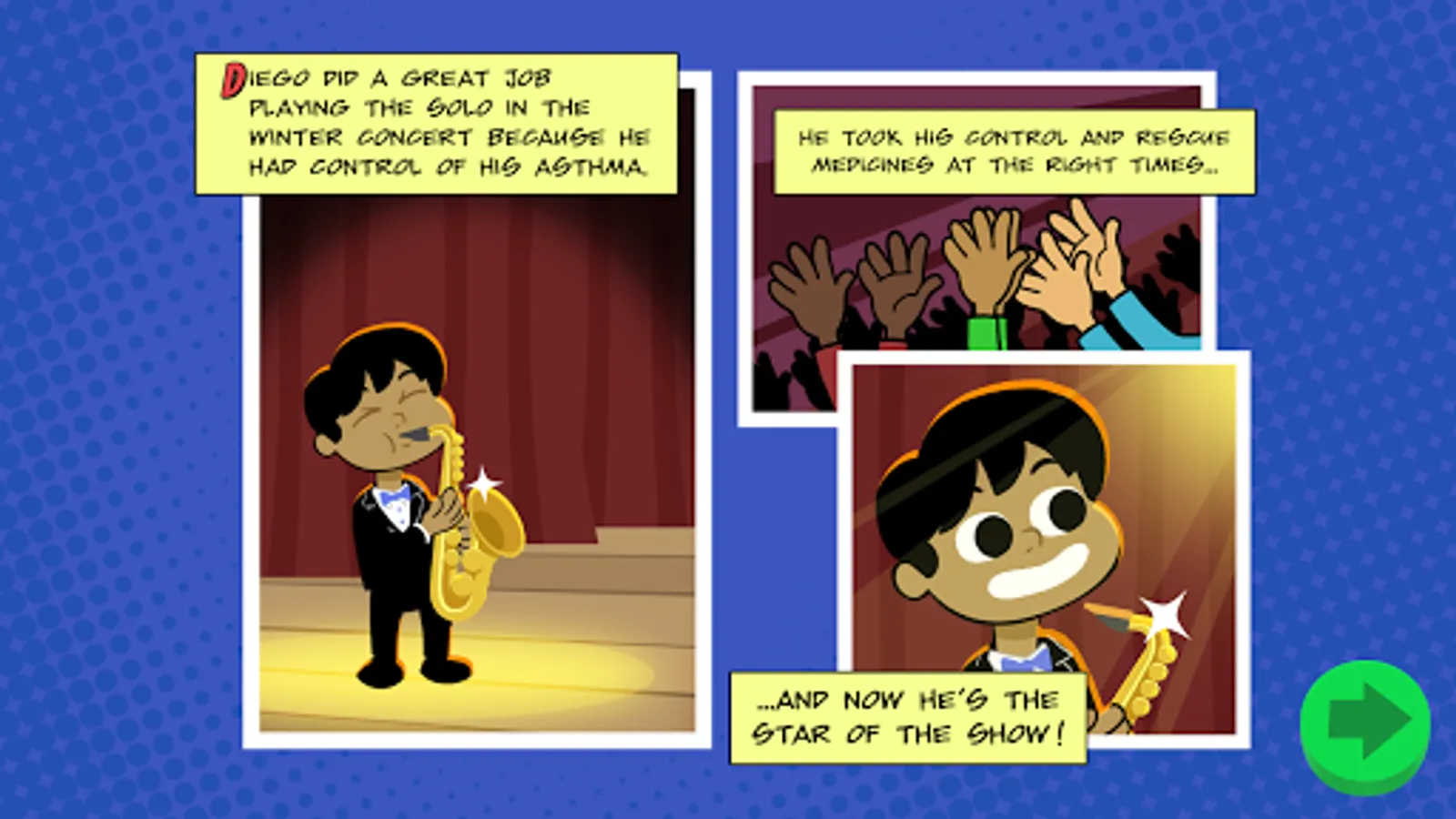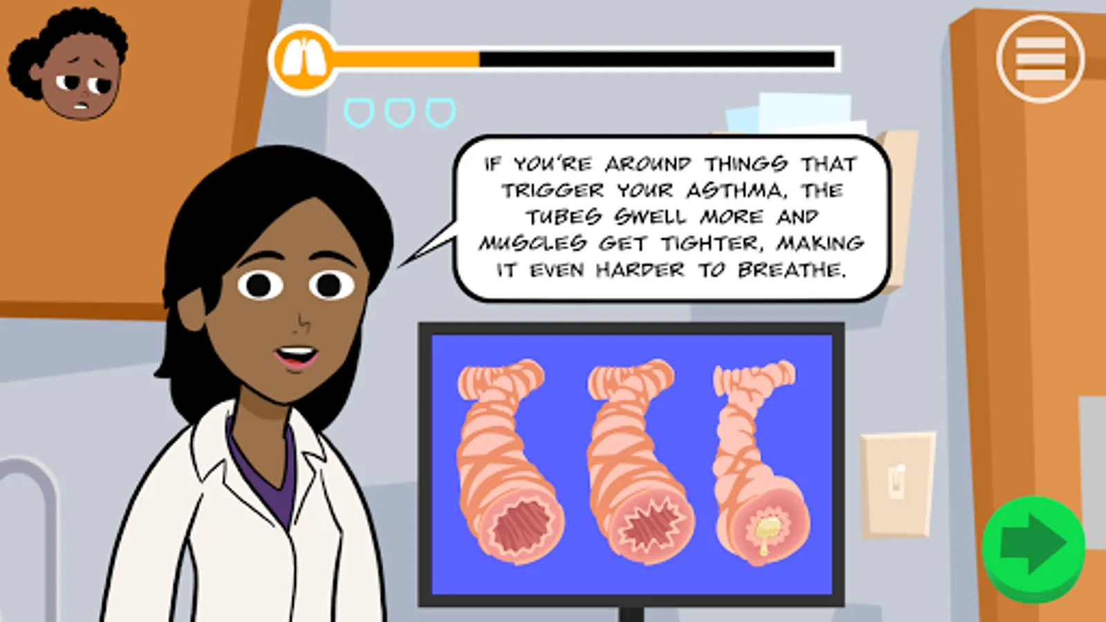 Breathe Better: Beat Asthma is a patient engagement game, administered by members of the health care team, where players interact with and guide various characters who experience asthma symptoms. The game focuses on reinforcement of critical self-maintenance skills necessary for asthma patients to stay out of the hospital. Players help the various characters take their control and rescue medications at the appropriate times. Players need to watch out for triggers like animal dander, cold weather, physical exertion, strong chemical odors, and so on because they could negatively affect the character’s progress and might cause them to be admitted to the hospital. At the end of the game, patients are given feedback on their guidance of each character - whether they helped them take their medication at the appropriate times and whether or not they were admitted to the hospital.