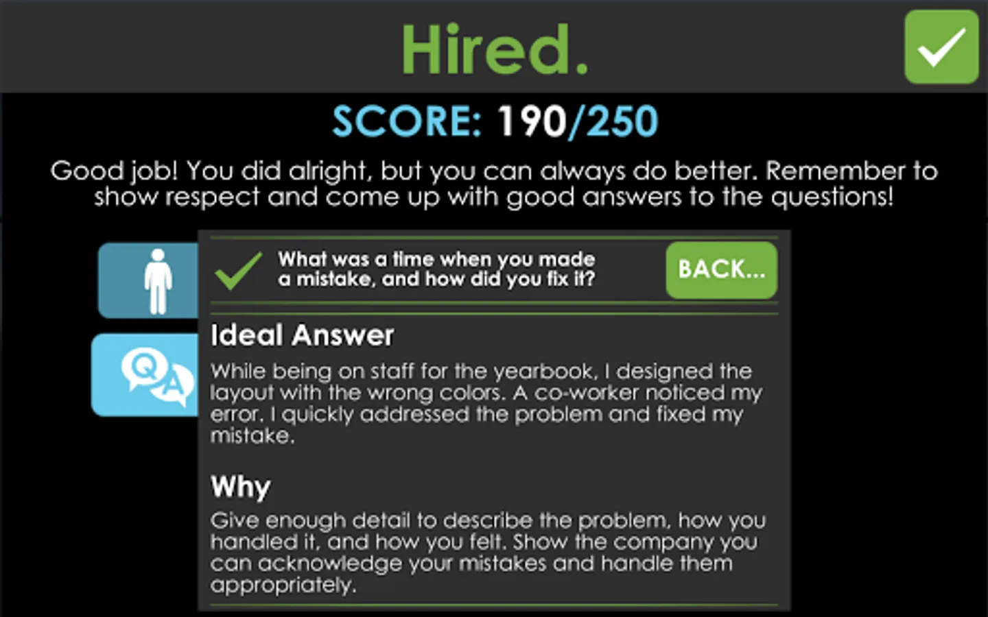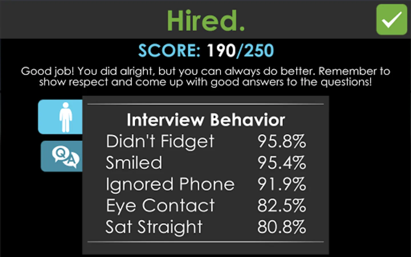 Test your ability to address and fix these bad behaviors before the interviewer notices. After each interview check and see if you got the job. View your answers to the questions and also check out a detailed summary of how you did overall.
