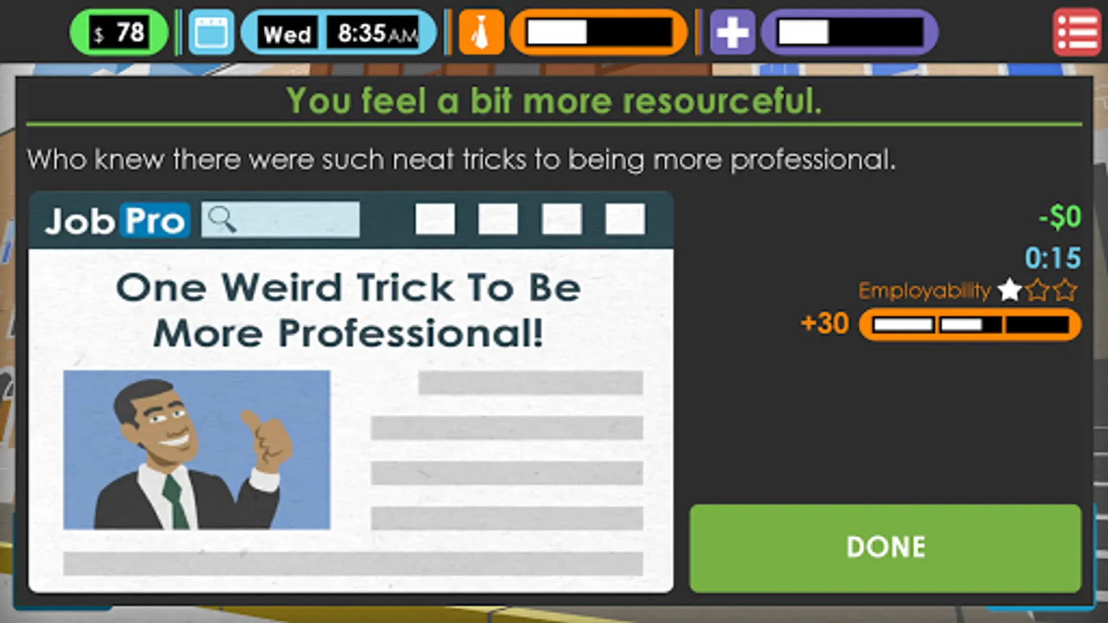 You’ve got the job, now comes the hard part: balancing all of life’s competing demands. JobPro: My Life is about YOUR LIFE, where you must make decisions around your work, health, and social life to try and stay on top of it all. Spend a week choosing what to eat, who to hang out with, how to spend your money, and where to spend your time. Practice general life skills in JobPro: My Life and see if you can maintain your professionalism and well-being throughout the week.