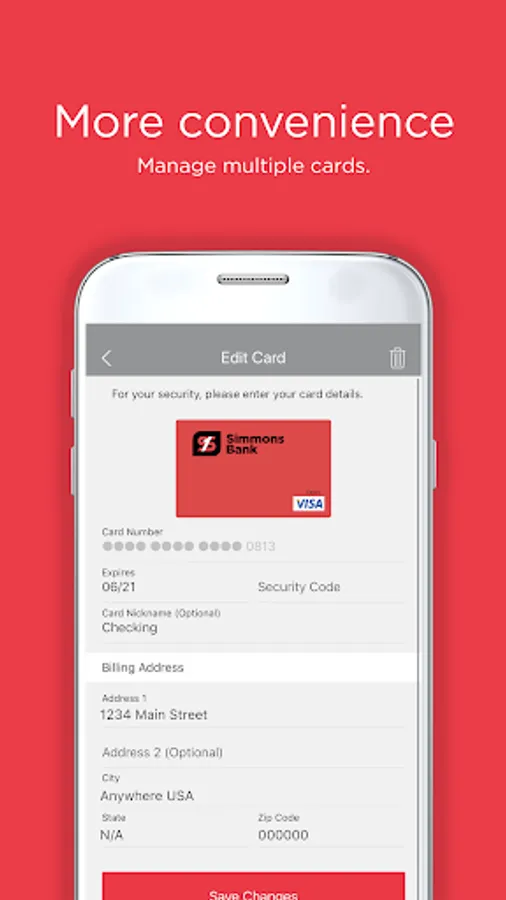 Use this app in conjunction with Simmons Bank Anywhere app to get the most out of your card. For the Simmons Bank Card Controls app, you will create a new username and password.