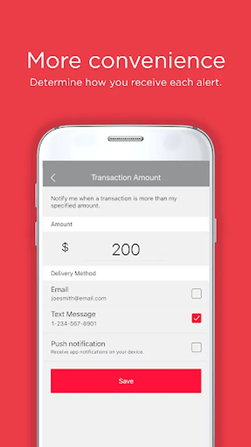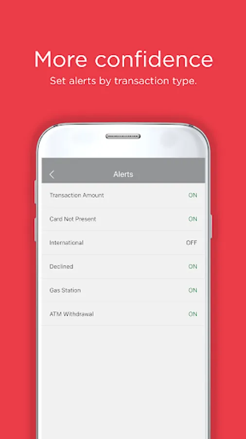 *Receive alerts based on transaction type via text, push notification and/or email when your card is used in the following ways:
