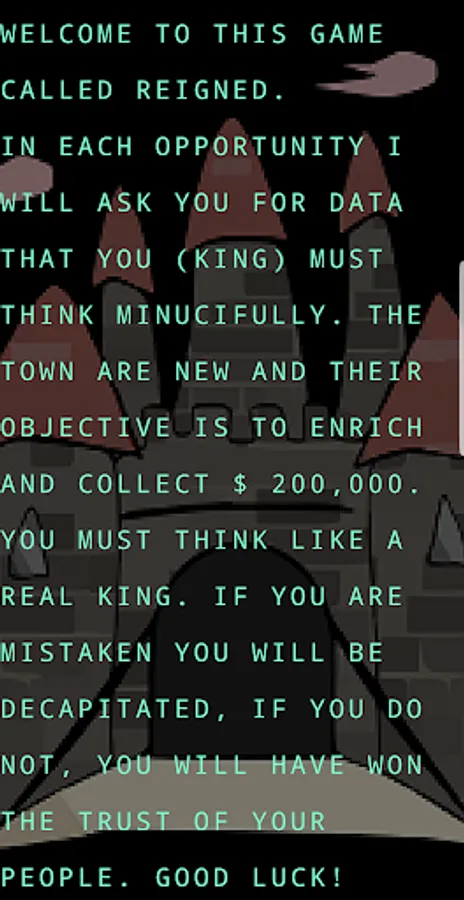 You will govern a small town with few resources. Your objective is to make that town rich and that all its inhabitants are very happy. To fulfill your goal, you will have to rule the kingdom for 80 years, and within that period you will have to have a capital of 200,000 dollars.