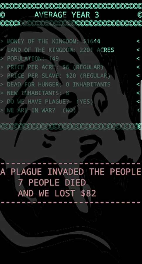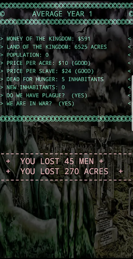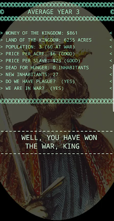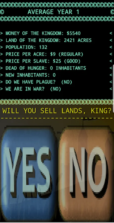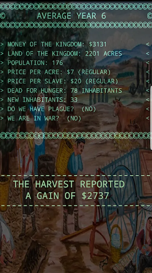 Each stage of the game represents a year. At the beginning of each year, it will inform you of the resources you have. The total money, the amount of land you own measured in acres, the number of inhabitants, the price of each acre, and the sales price of slaves captured in wars.
