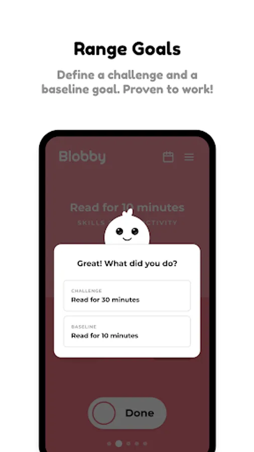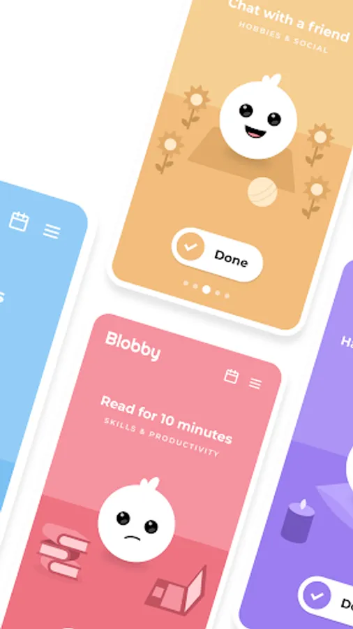 Blobby is your cute buddy to help you develop healthy habits in the most important aspects of your life. Keep your Blobby happy by sticking to your habits!