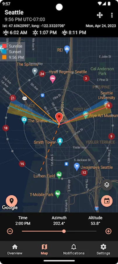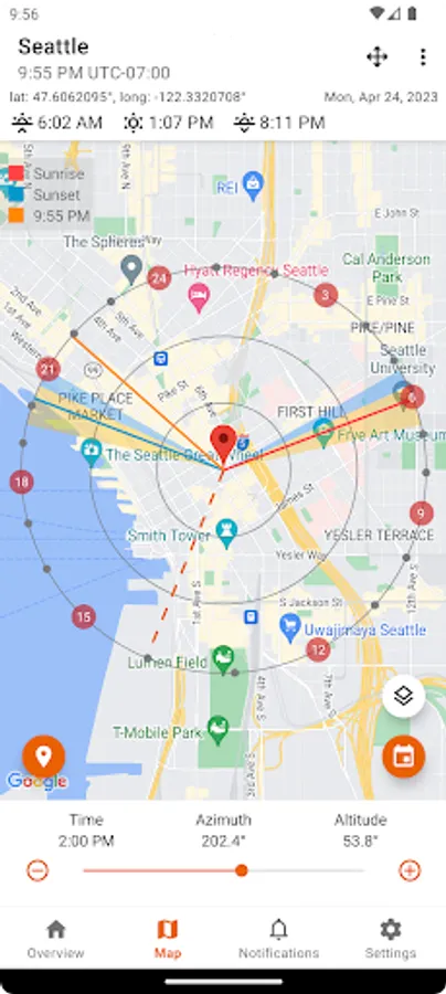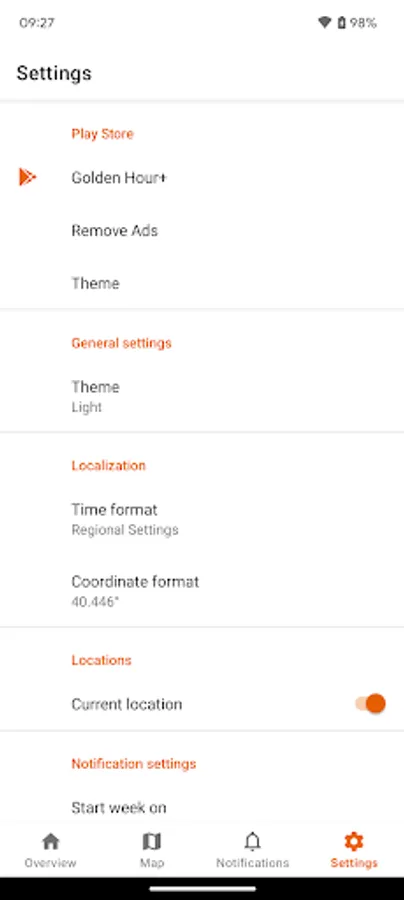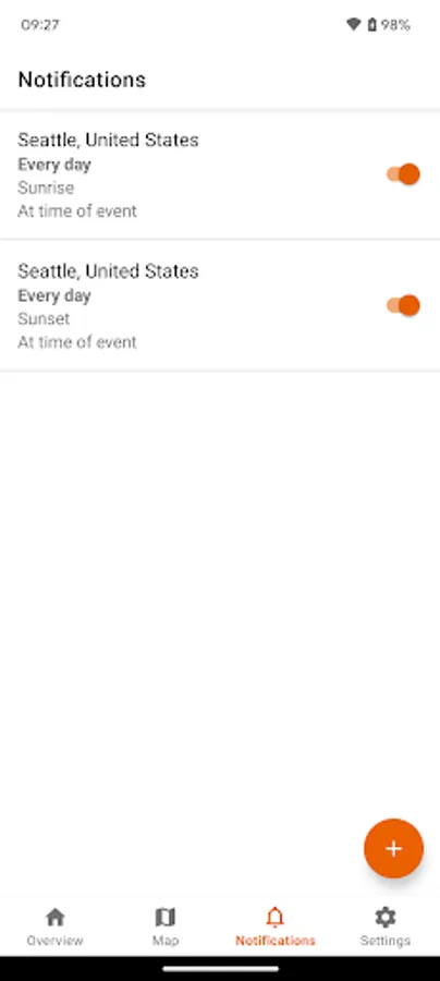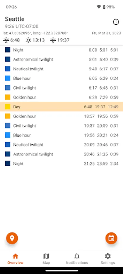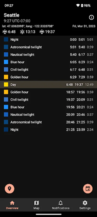 - Set up notifications for upcoming sunrises, sunsets or golden hours