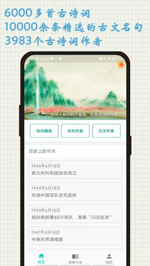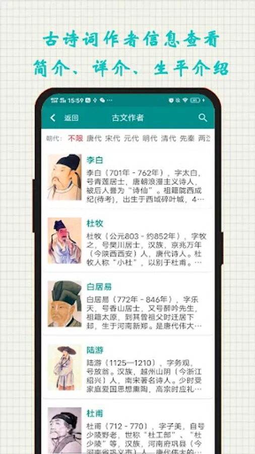 * APP收录了近6000首古诗词,10000条精选的古文名句,3983个古诗词作者,内容涵盖各朝代的经典诗词古文著作;