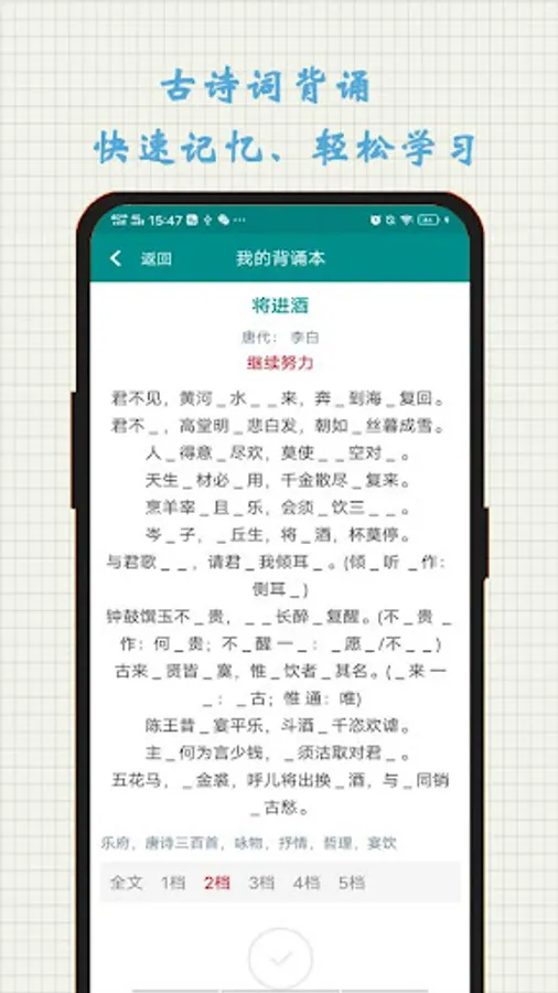 * 支持诗词真人语音朗读,支持古诗词分享;