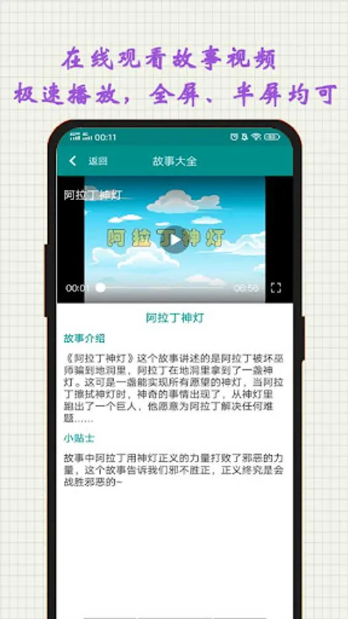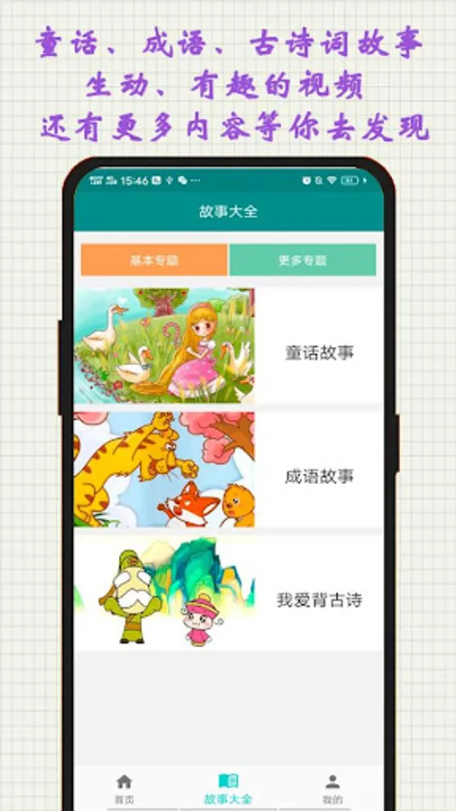 * APP的故事大全包含有童话故事、成语故事、古诗词故事等,以及更多的故事专题内容,支持在线视频观看;