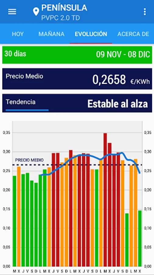 'Save on Electricity' is a simple and very easy to use application that shows the price per kilowatt per hour. With this free information you can anticipate and plan the use of the appliances that consume the most energy and save on your next bill from now on.
