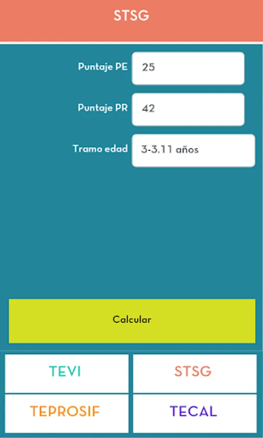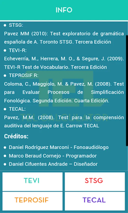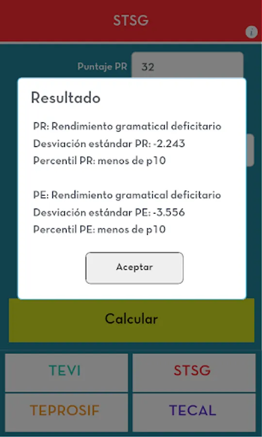 It allows to quickly obtain the interpretation of the scores of the latest versions of the speech therapy tests TECAL, TEPROSIFR, TEVI-R and STSG, widely used in Chile to evaluate and diagnose Specific Language Disorder.