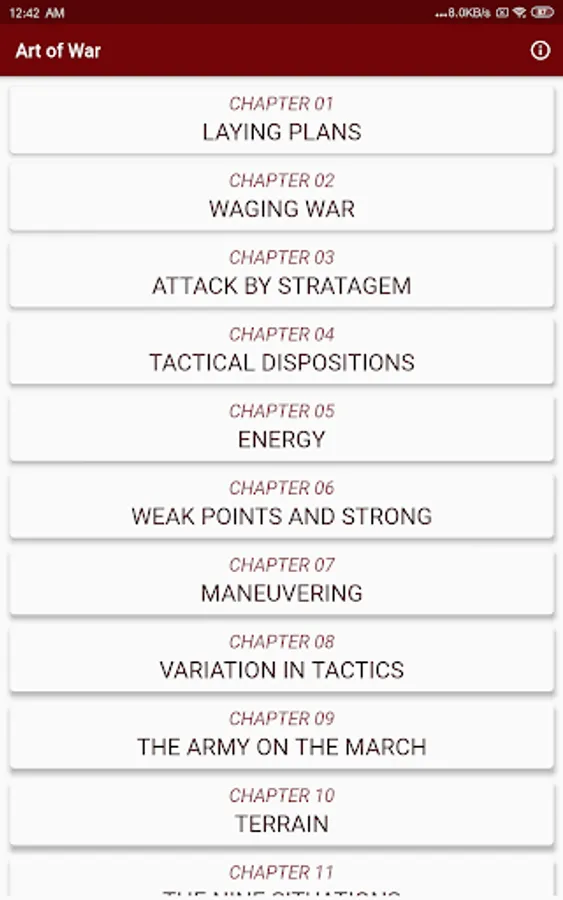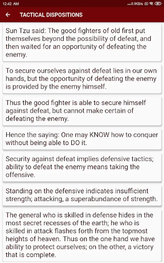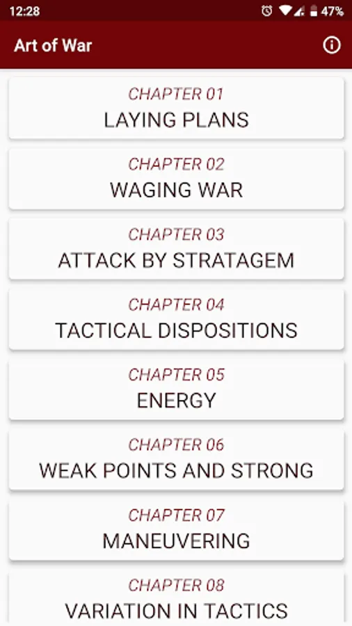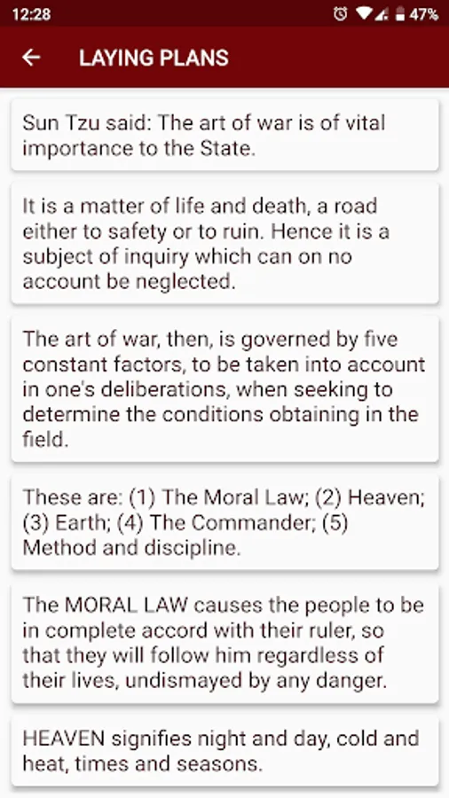 This App contains the whole Art of War text in English for easy reading. The text is based on the English translation by Lionel Giles first published in 1910.