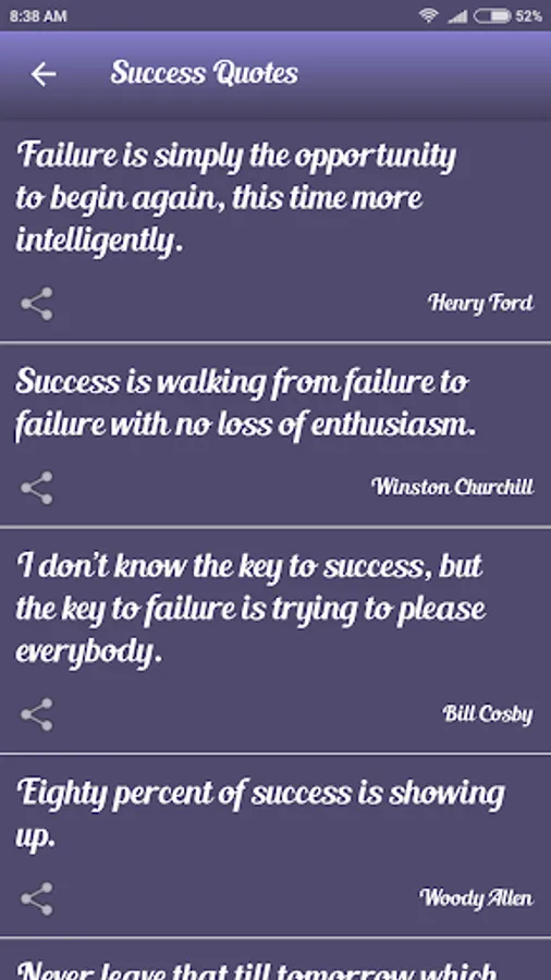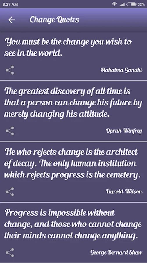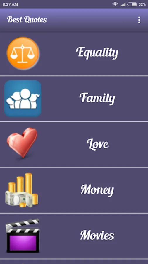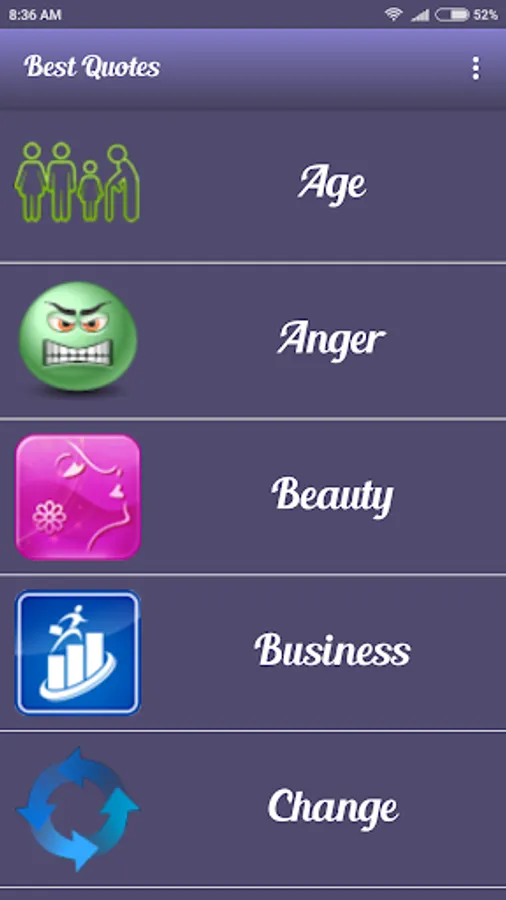 This app contains numerous quotes of various topics. Topics include Age, Anger, beauty, Business, Change, Children, Courage......etc.