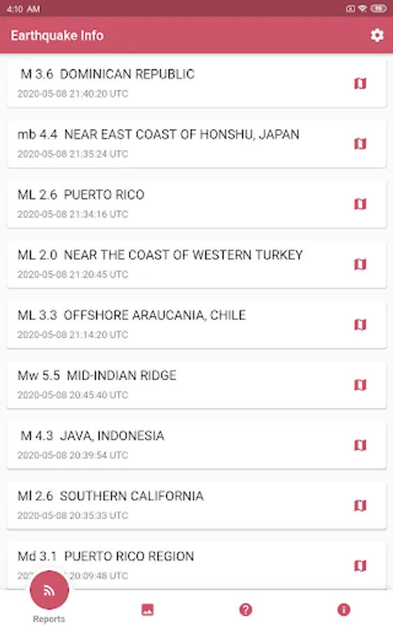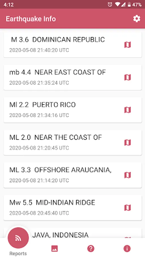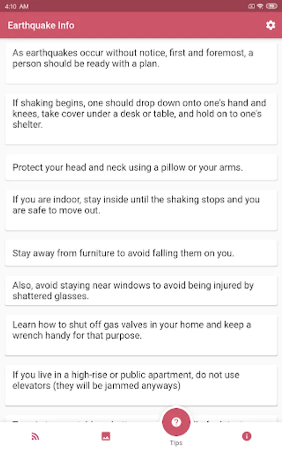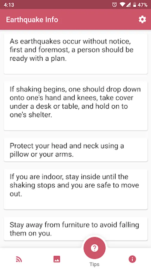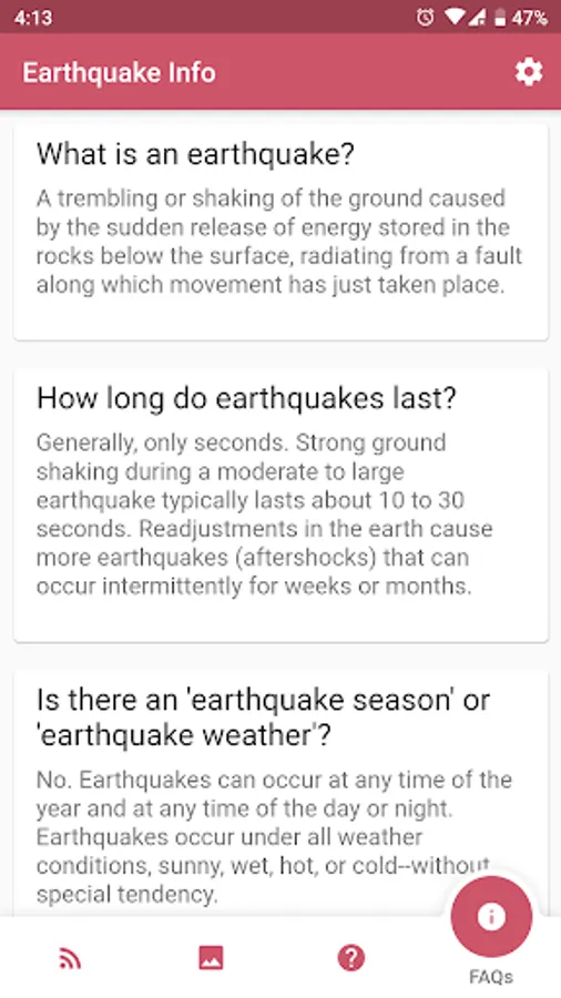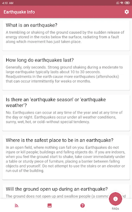 A simple app to get latest earthquake reports and photos. The app contains faqs and safety tips regarding earthquake.