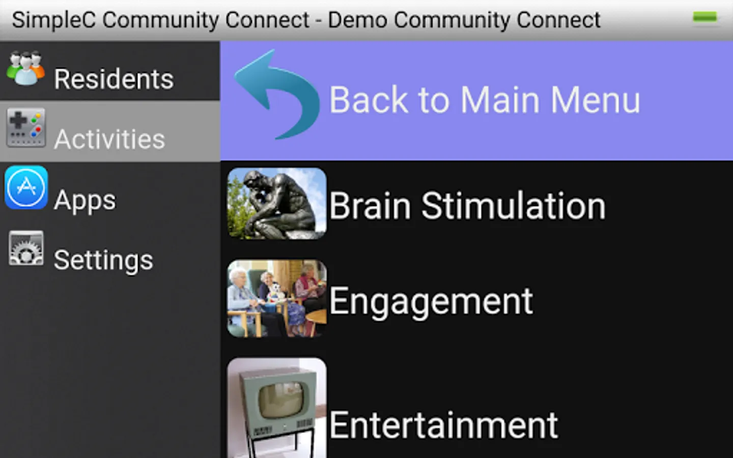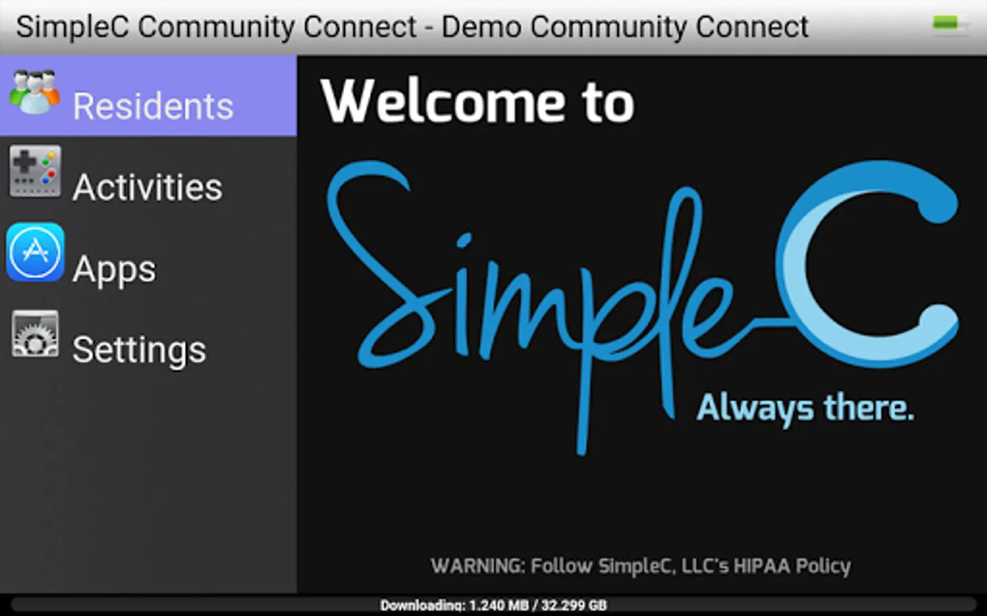 SimpleC Community Connect is used on televisions in elder communities. In order to use the application, it needs to be activated by SimpleC. This is not a consumer application.