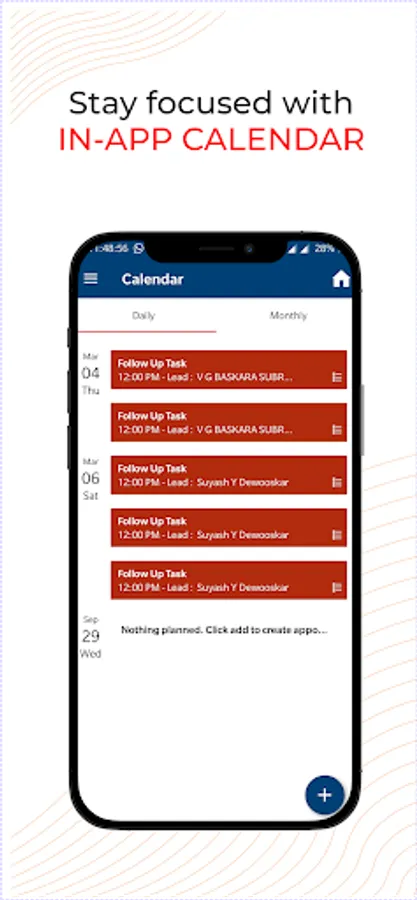 - In-app calendar to plan your day and other activities with follow-up and reminder feature