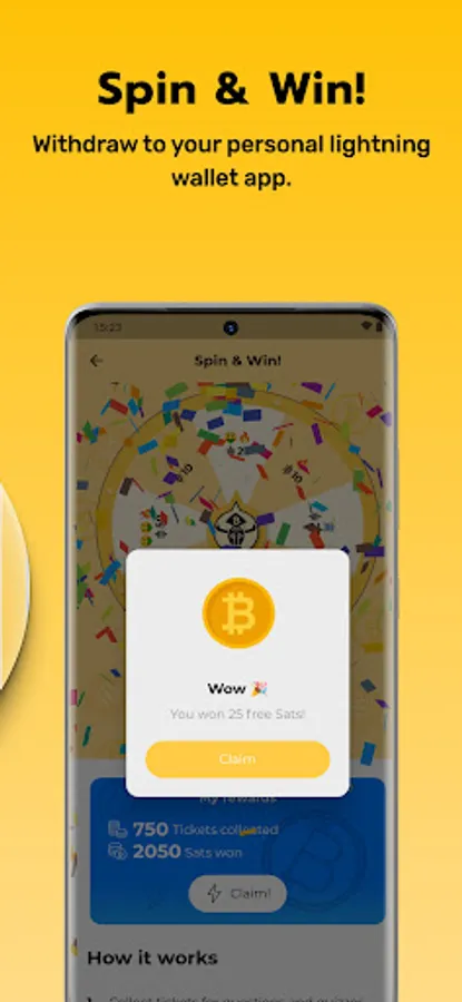 To enter the draw you collect Simple Bitcoin Tickets. Each one counts as an entry to the draw in which you can win a bitcoin prize. If you win you can cash out instantly to one of these supported Bitcoin wallet apps with 'Lightning Network' support on Google Play; Muun, Zebedee, Wallet of Satoshi, Breez, and Blue Wallet.