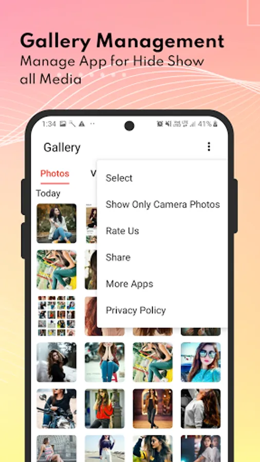 Gallery app is same as calculator vault is the gallery vault app can secretly Hide Photos, Hide Videos and other files without anyone knowing as gallery lock installed in your phone. 🎴