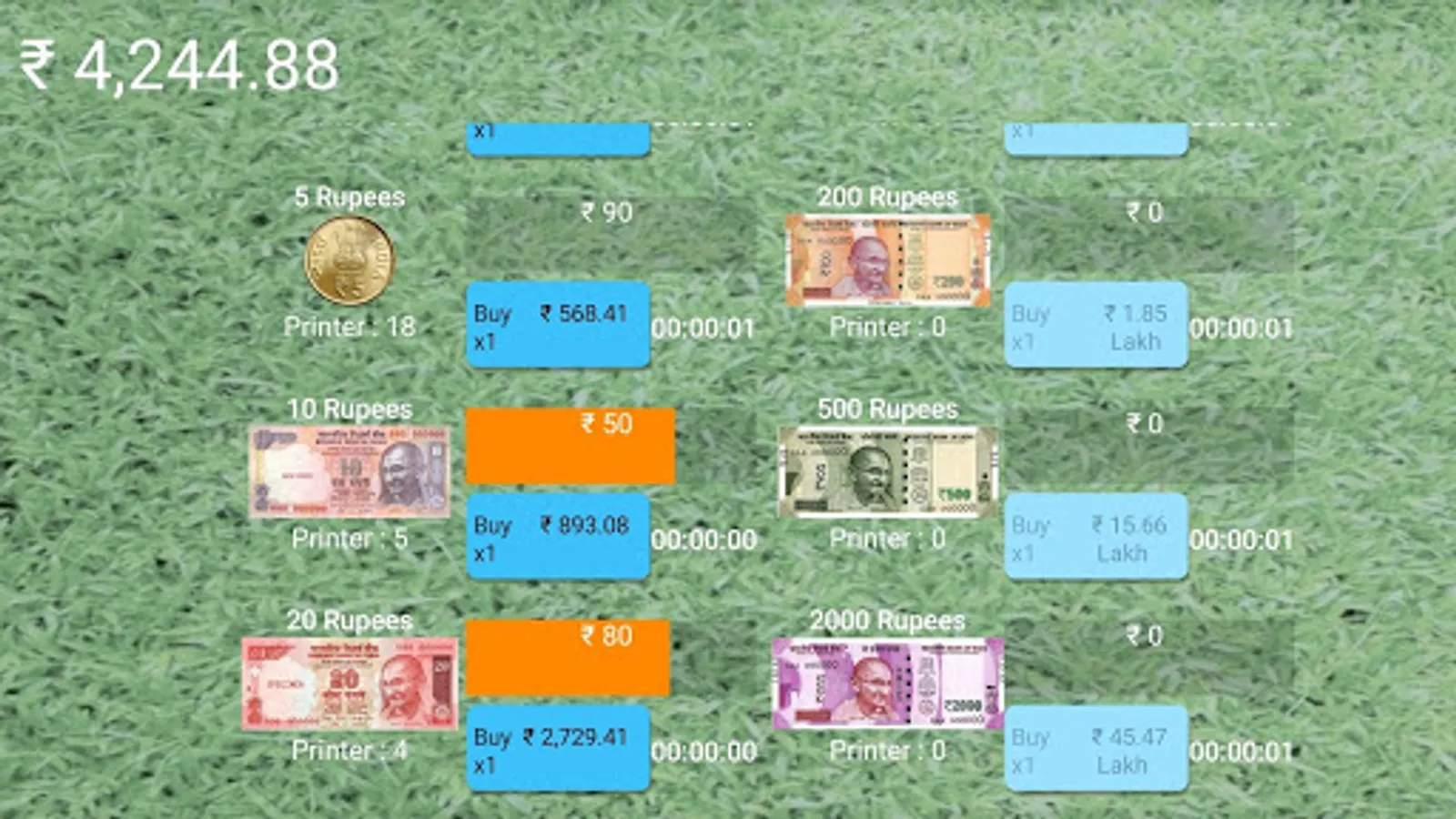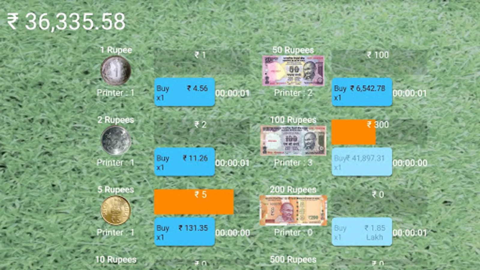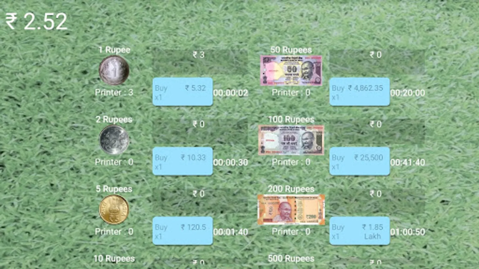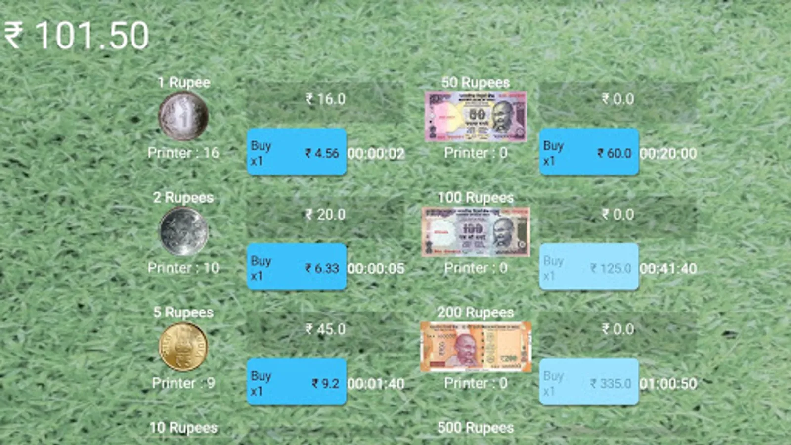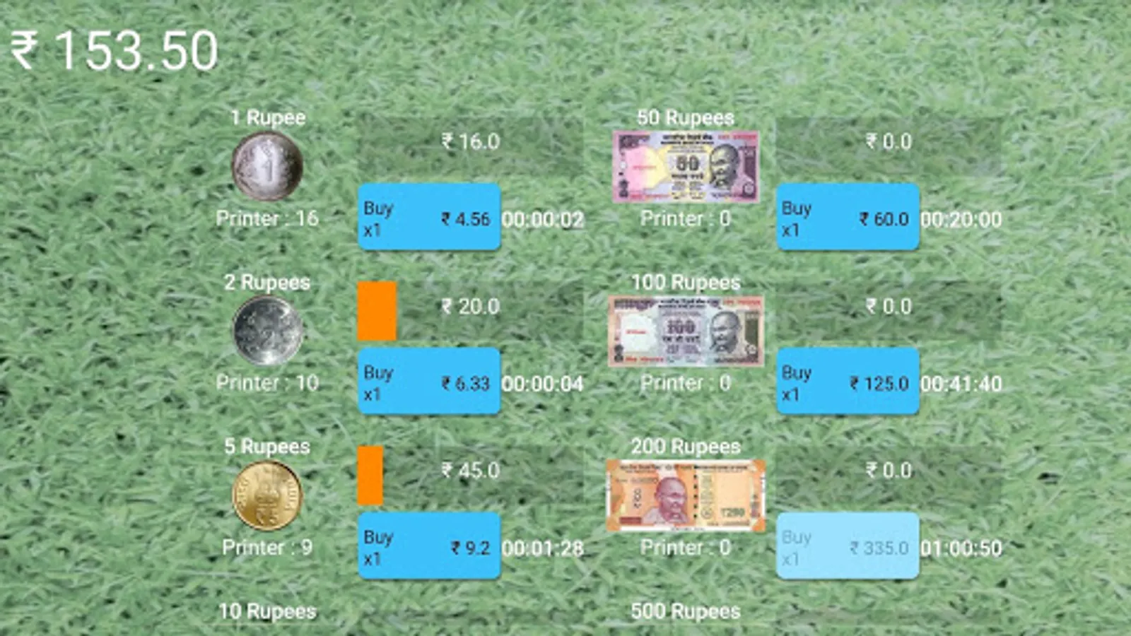This game contains various currencies used in India as on date. Start with lowest denomination of "₹ 1" and start printing currencies while earning little profit. Later on unlock more currencies upto "₹ 2000" and earn huge profits and become a Printer Tycoon.