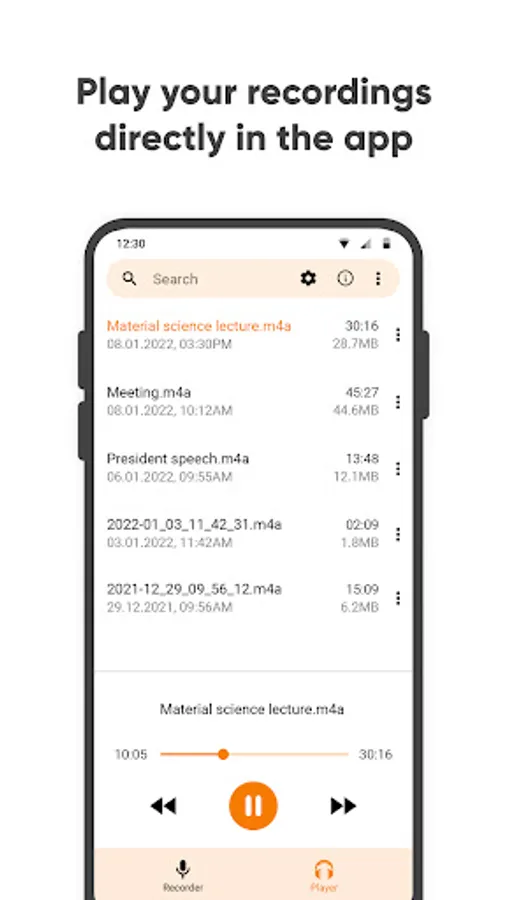 This recording app offers a helpful audio recorder and voice recorder player too so that you can listen to your recordings quickly within this recording app, maybe rename or delete them. You can customize the shown date and time format for better user experience.