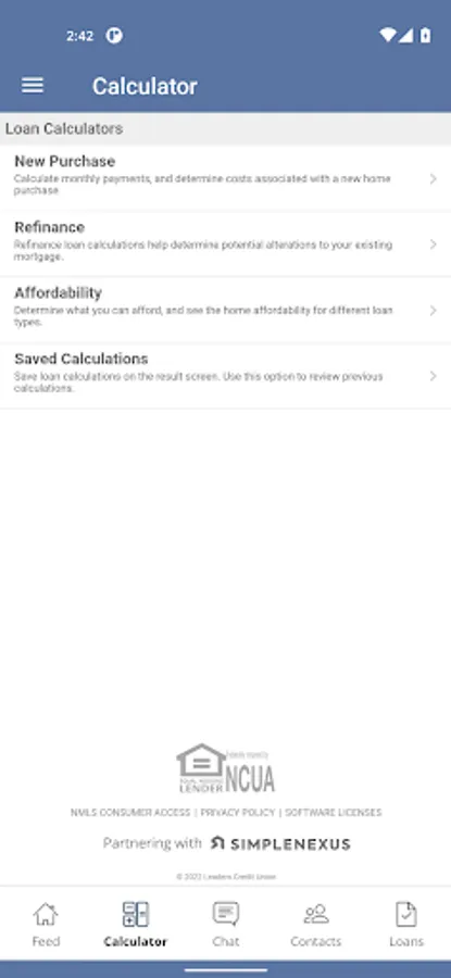 The calculations provided by the Leaders Home Loan Mobile App are a great tool in providing you with an idea of what homeownership might mean for you, whether you are buying or refinancing. However, please be sure to contact your Leaders Home Loan Officer for a customized solution tailored to your specific financial situation, needs, and goals. Your Loan Officer can also assist you with any questions you have about your loan and the loan approval process.