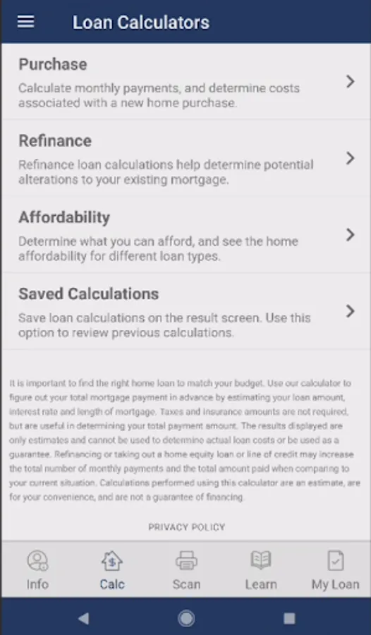 The calculations provided by the Highlands Residential Mortgage app are useful in giving you an idea of what homeownership or refinancing might mean for you. However, please be sure to contact your Highlands Residential Mortgage Loan Officer for a customized solution tailored to your specific financial situation, needs, and goals.