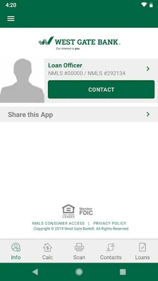 •Easily access contact information for your West Gate Bank loan officer and real estate agent.