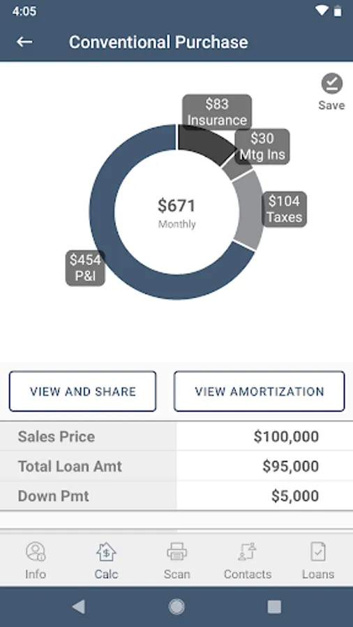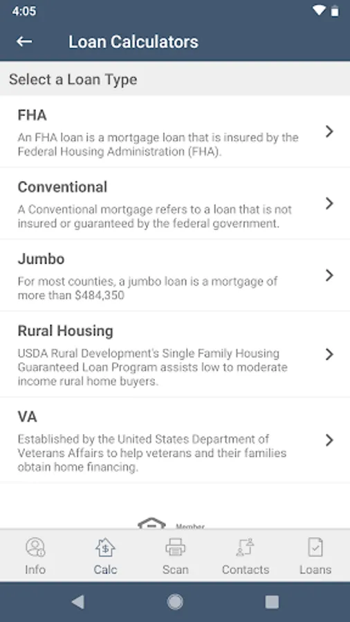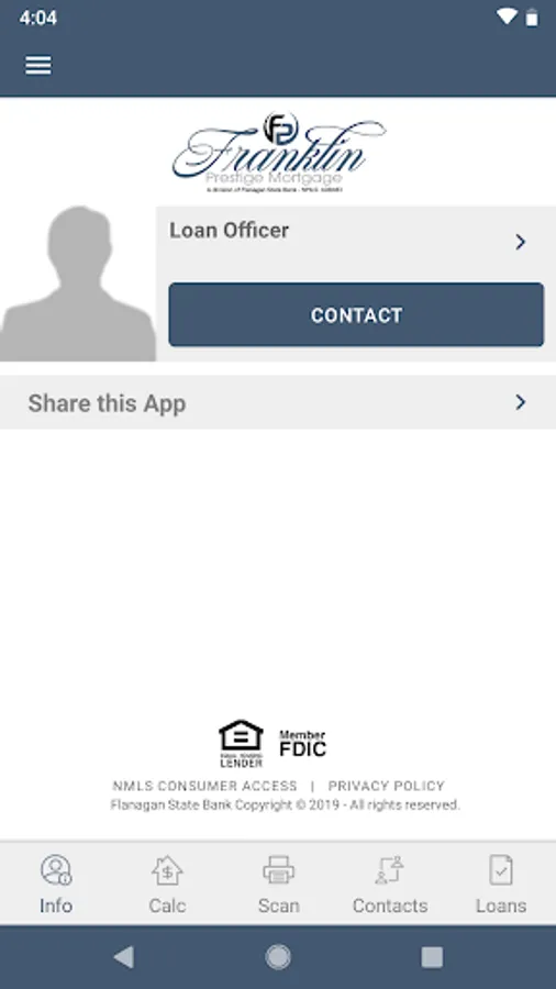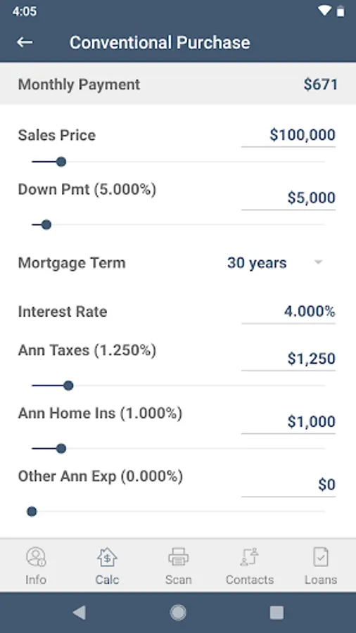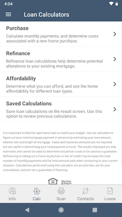 The calculations provided within the app help to show where you might qualify for a loan. However, please contact a Franklin Prestige Mortgage Loan Officer to help determine exactly what you will qualify for. Your Loan Officer is always happy to answer questions and help you get from starting a loan application to closing on a loan application.
