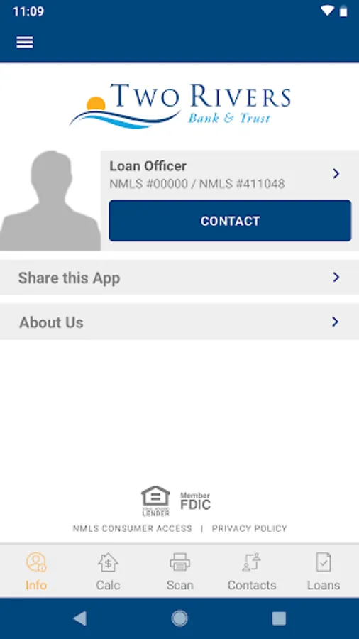 The calculations provided by the My Neighborhood. My Mortgage. mobile app are useful in giving you an idea of what homeownership might mean for you. However, please be sure to contact your Two Rivers Bank & Trust Loan Officer for a customized solution tailored to your specific financial situation, needs, and goals. Your Loan Officer can also assist you with any questions you have about your loan and the loan approval process.