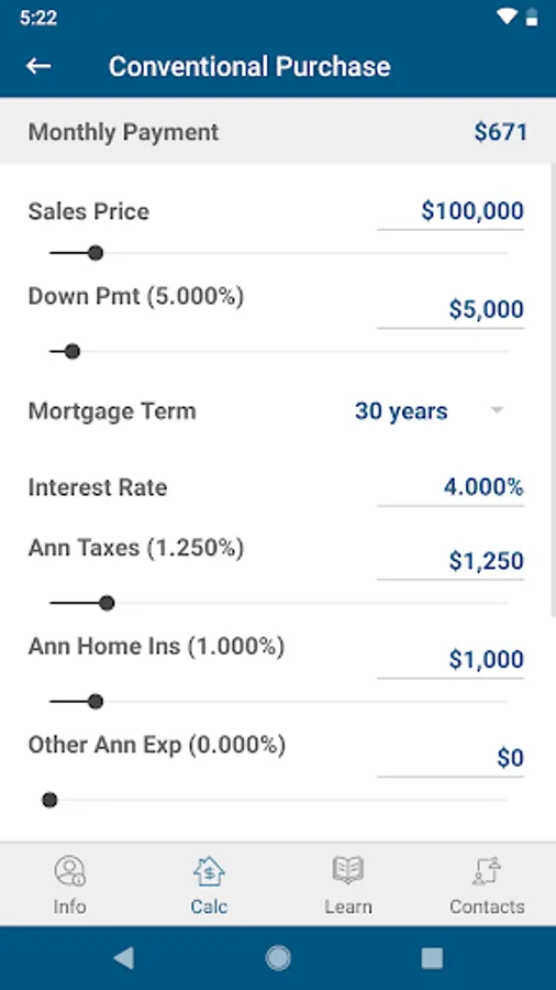 CONVENTIONAL – Choose your home price, down payment percentage & term, it even assists with mortgage insurance calculations
