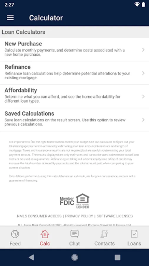 In addition to providing several tools to assist you with your mortgage lending needs, the D.L. Evans Bank Mortgage App allows you to quickly apply for and work through the home loan process; safely and securely, 24/7, all conveniently from your smart phone. Whether you are looking to purchase or refinance a home, are curious about different home loan scenarios, or are a real estate agent hoping to help your clients enjoy a better home buying experience, this tool will help simplify the home lending process.