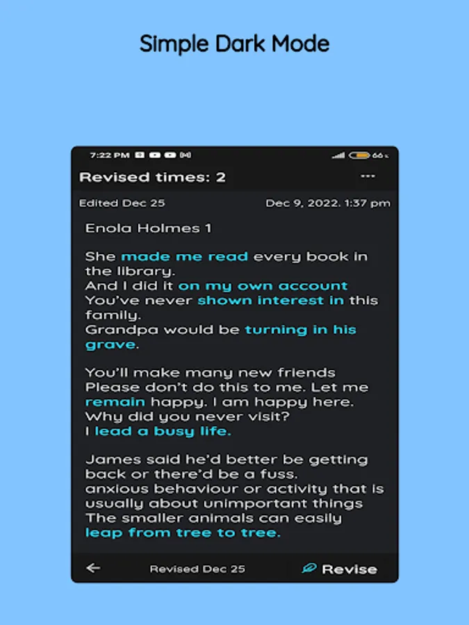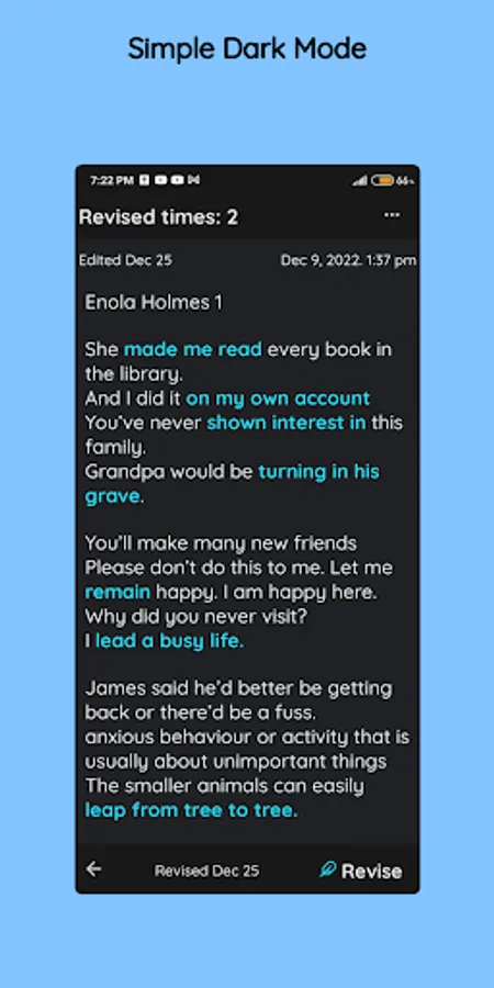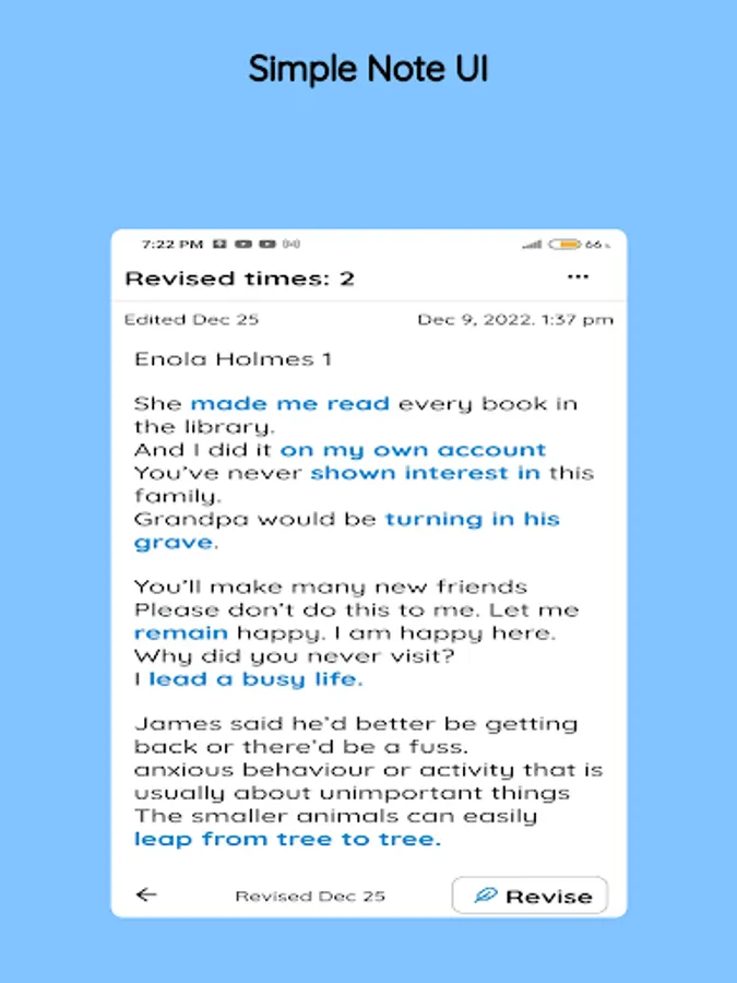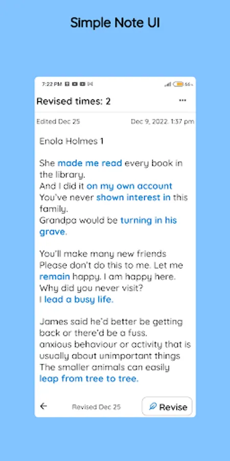 SimpleNote remembers the last time you revised on each note. And you can simply revise your notes on the go or even when you have 20 seconds of free time. You can easily sort your notes , like "Last Revised First".