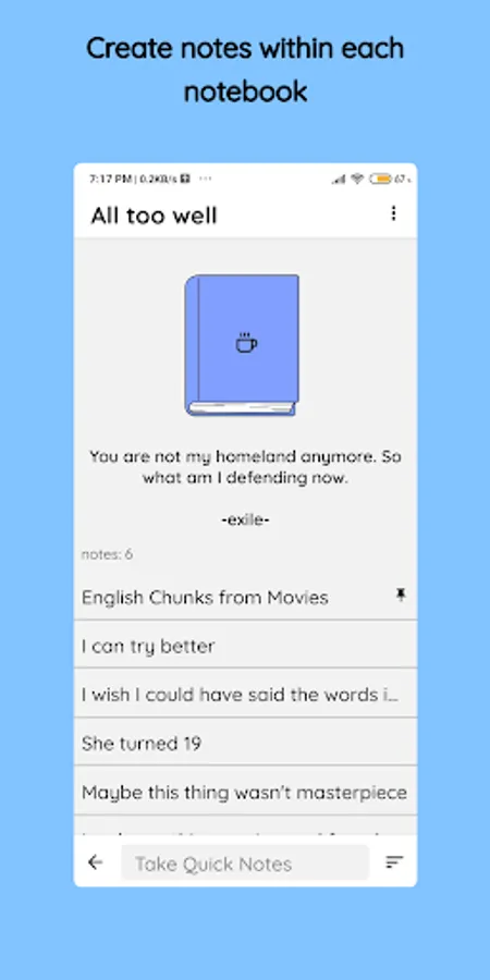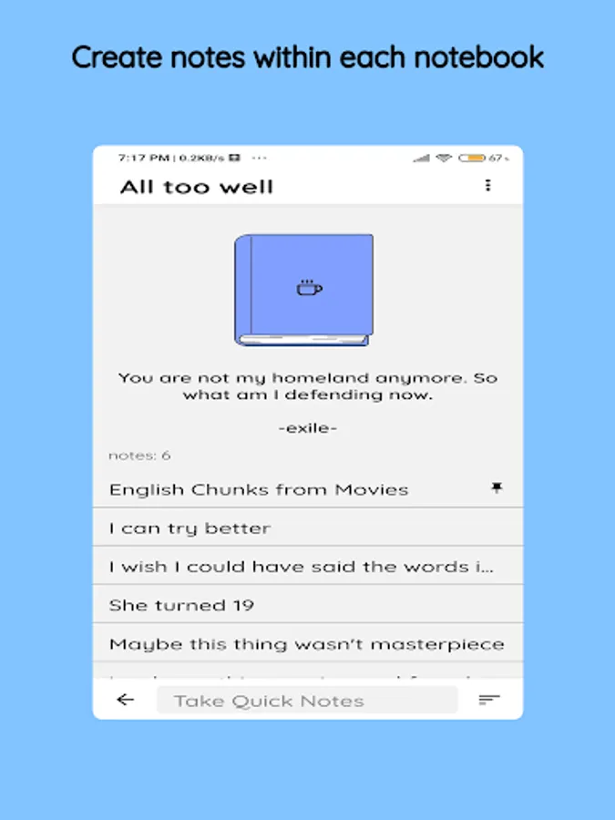 With adorable notebooks, let your inner artist paint the app by making your custom notebooks and adding your favorite quote on each notebooks.