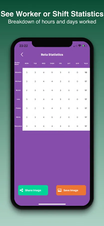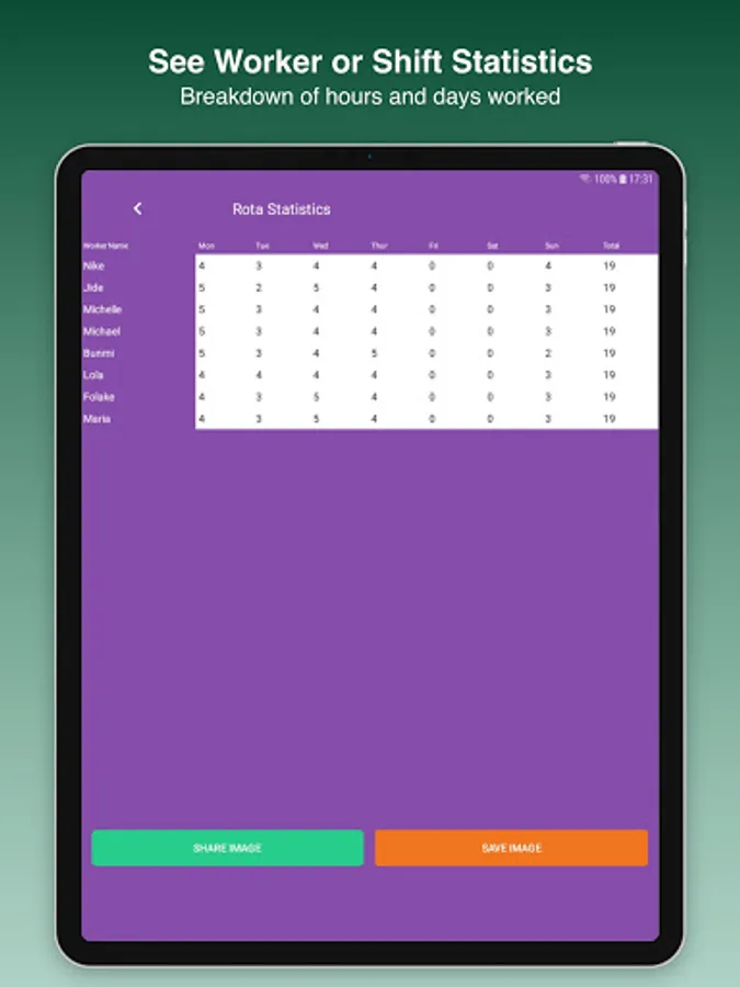 *See Rota breakdown (how many weekdays, weekends & hours each worker is rostered to work and more worker statistics)