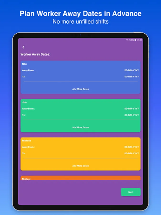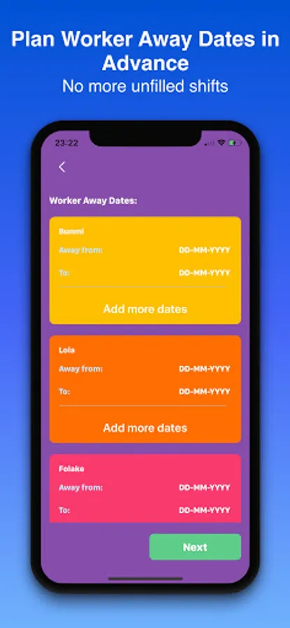 • Worker away dates: ***the App WILL NOT schedule workers to work on those dates**