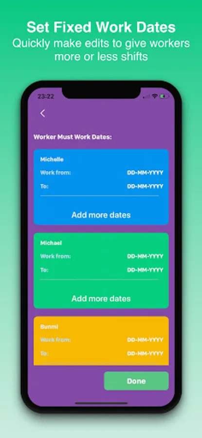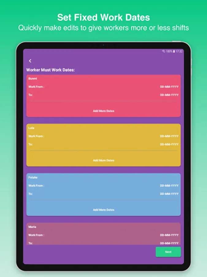 *Set Worker must work dates: ** the App WILL schedule workers to work on those dates**