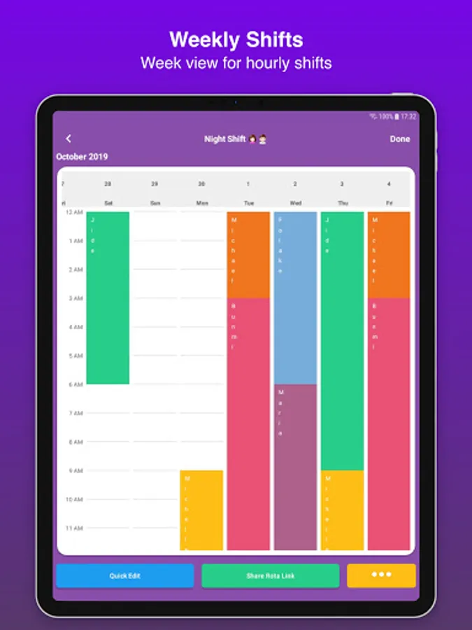 The simplest tool to save your shifts or create & share a rota for rostering workers into hourly or daily shifts.