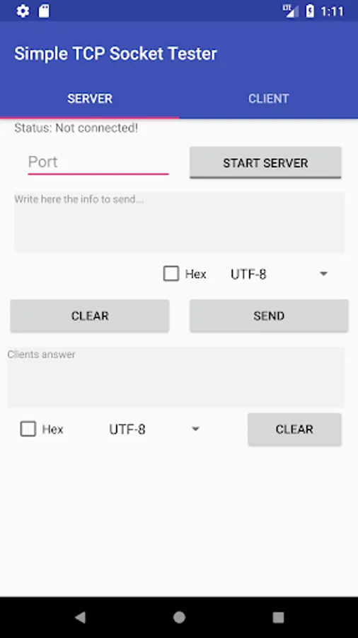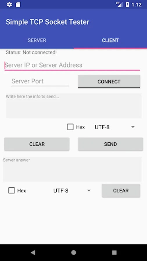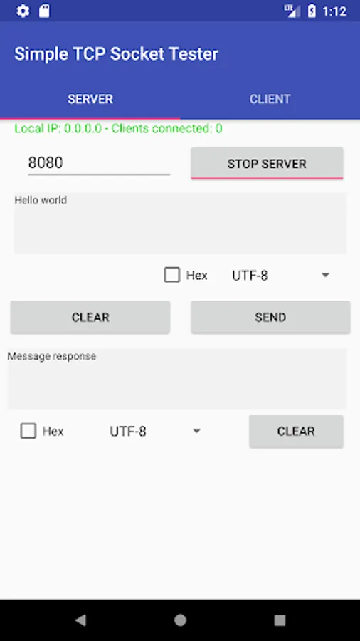 A simple app to anyone that needs to test TCP sockets. You can send and receive strings (UTF-8 or ISO-8859-1) or bytes over a network in client or server mode.