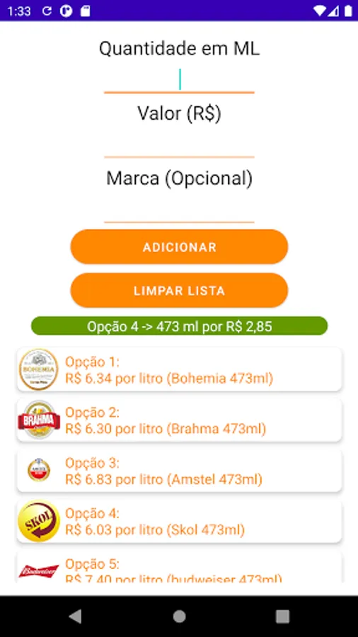 With the Beverage Calculator you will never be at hand again. You put as many options as you want, and it shows you the value / liter of each. It also shows you which is the best option among those entered by you.