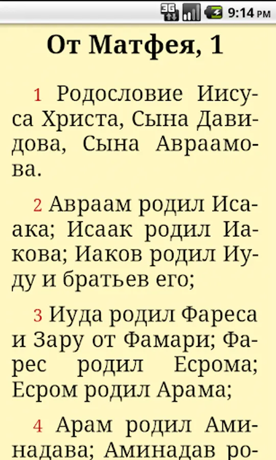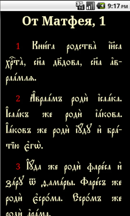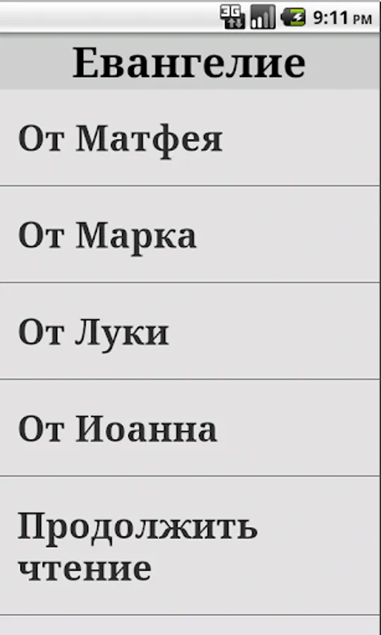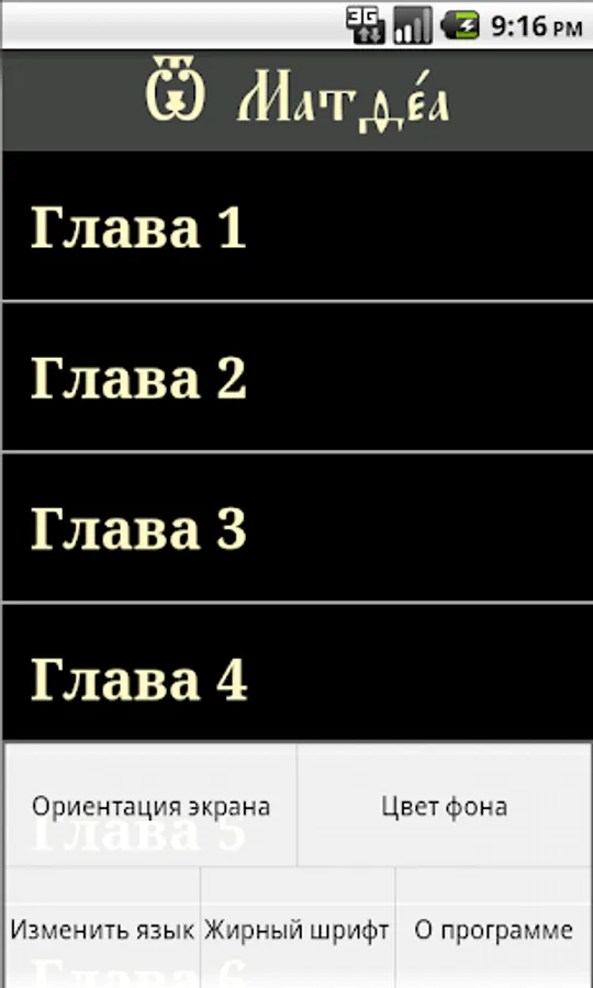 All the settings for this program are made through the menu. If your phone or tablet is not showing the menu button, you can call up on another. For pages with lists need to click on the title of the list for the pages with the text of the Gospel need to click in the upper left corner of the screen.