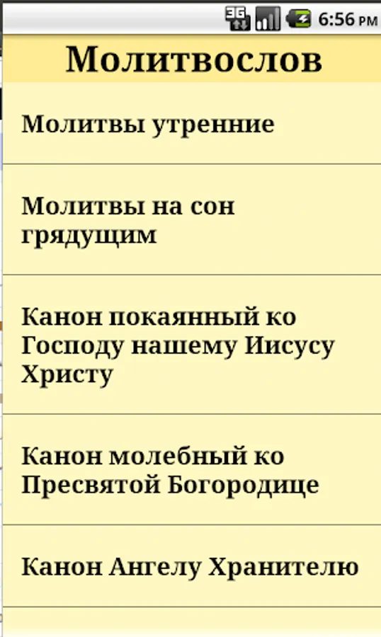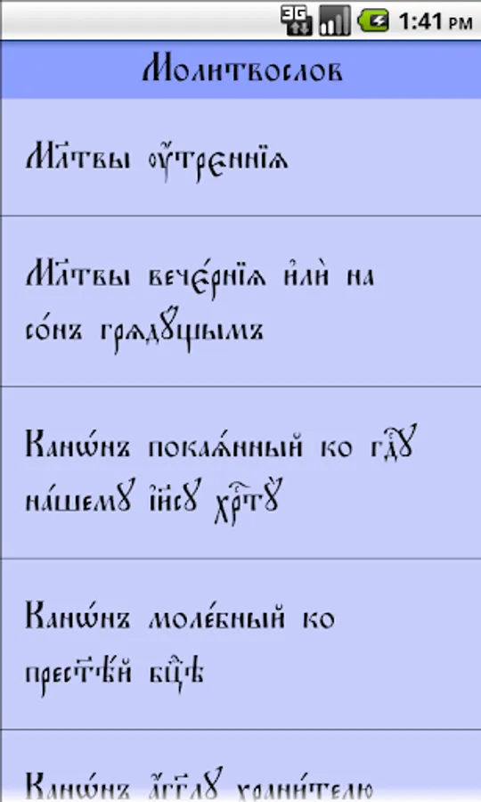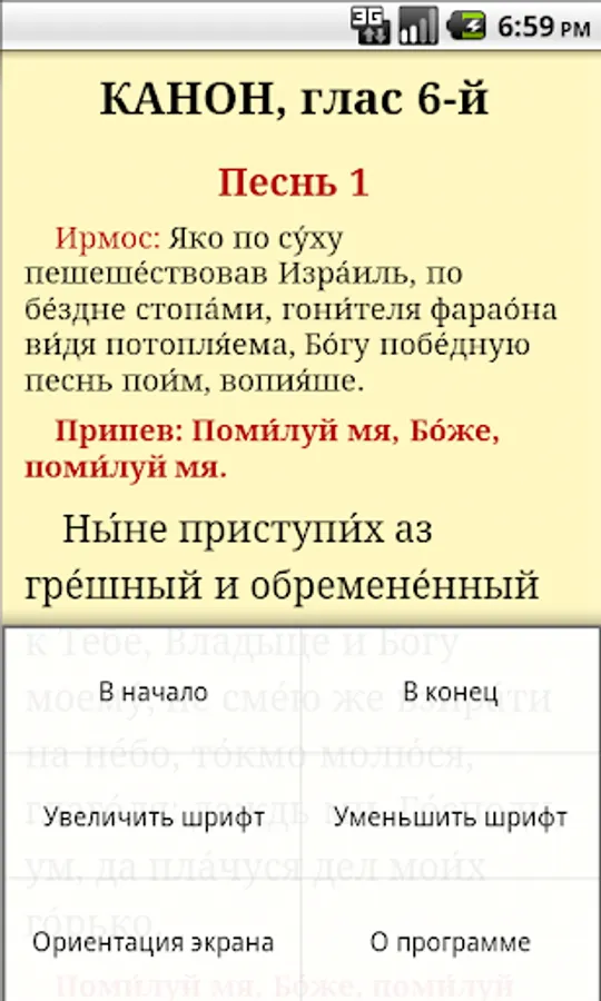 All settings for this application are made through the menu. If the menu button is not shown on your phone, then you can call the menu in another way. For pages with lists - you need to click on the title of the list, for pages with the text of prayers - you need to click in the upper left corner of the window.