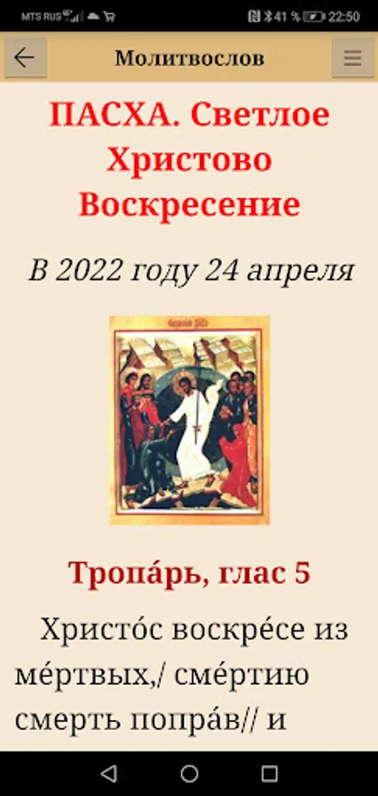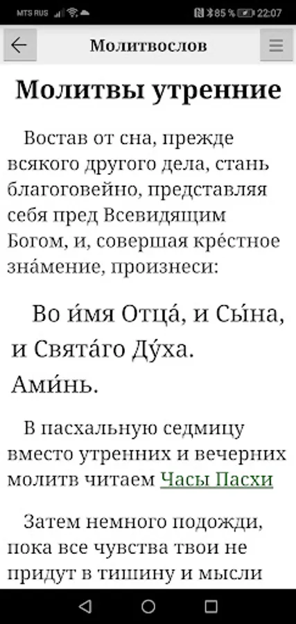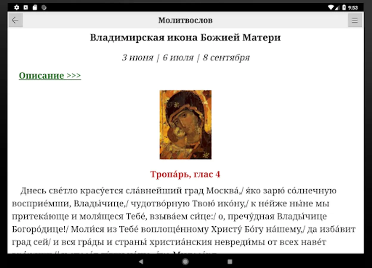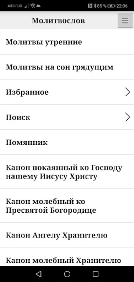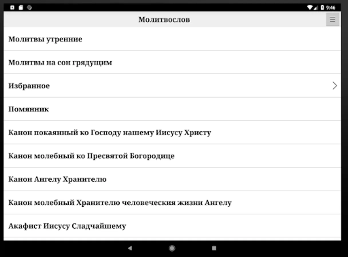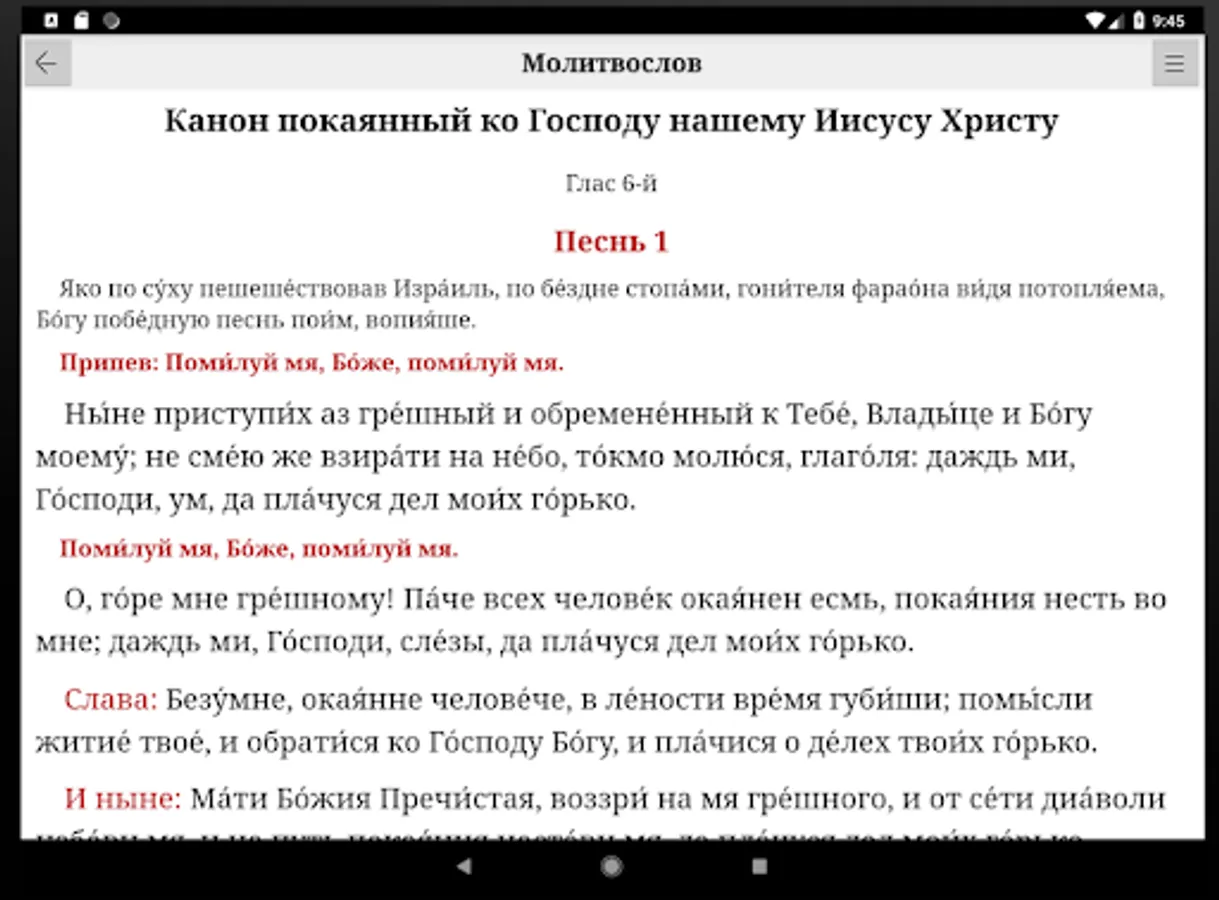 The application includes basic Orthodox prayers, morning prayers, evening prayers, prayers before Holy Communion.