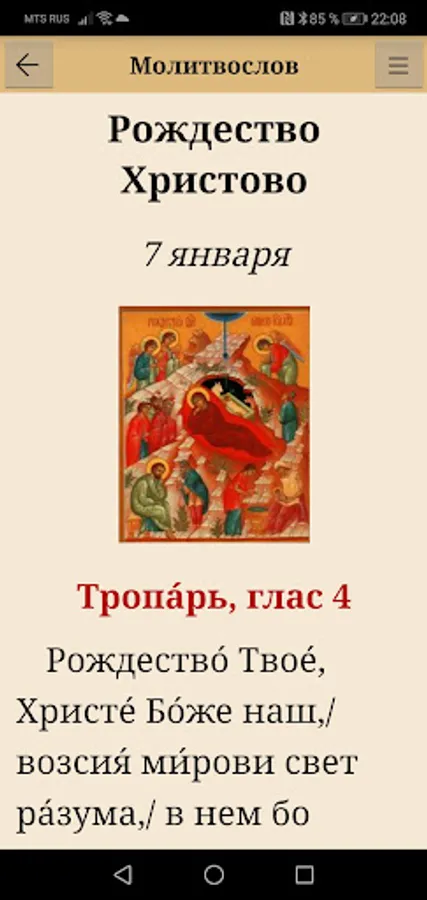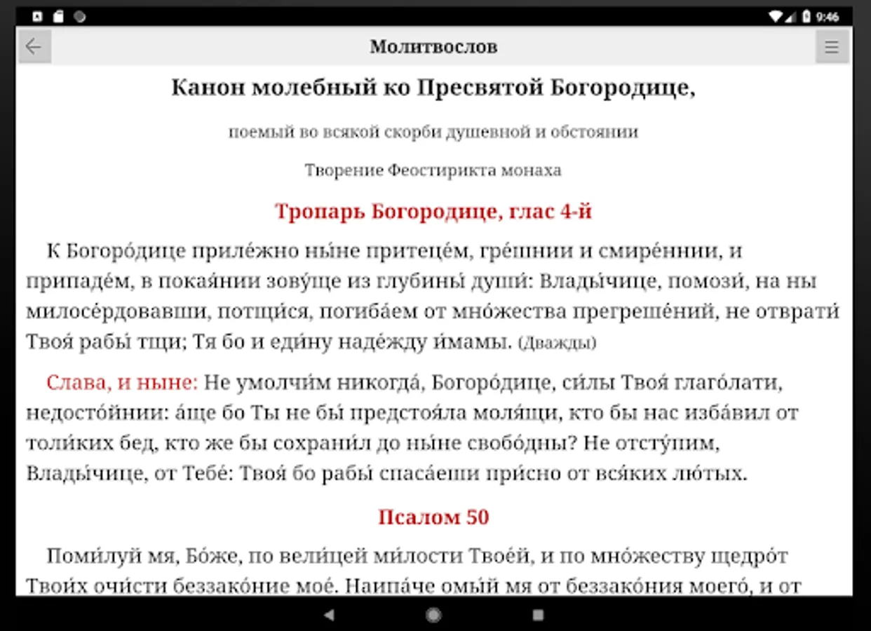You can set the language - read in Russian or Church Slavonic. Please note that in Church Slavonic the set of prayers is much smaller than in Russian!