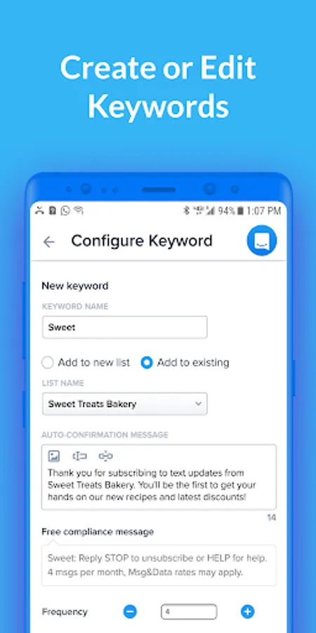 • Add or edits keywords that users can text to subscribe to your messages