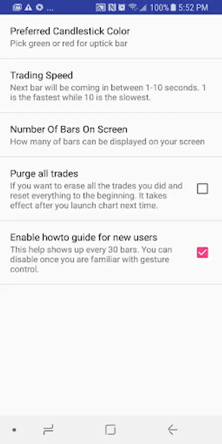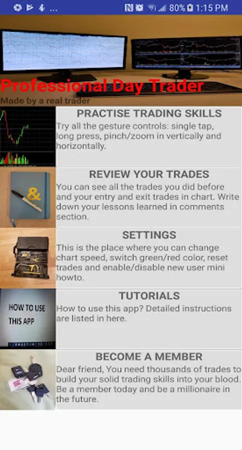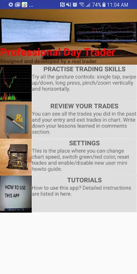 This app is designed for experienced users who wants to make a living from trading. Very beginner? Want to learn something first before practice? No problem, basic chart reading training/Candlestick pattern training is provided in learning center. The basic chart training is straightforward. It points out why non-pro unable to make money consistently and points out the right direction as well.