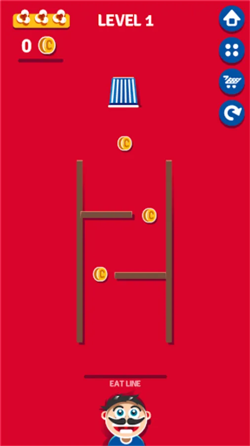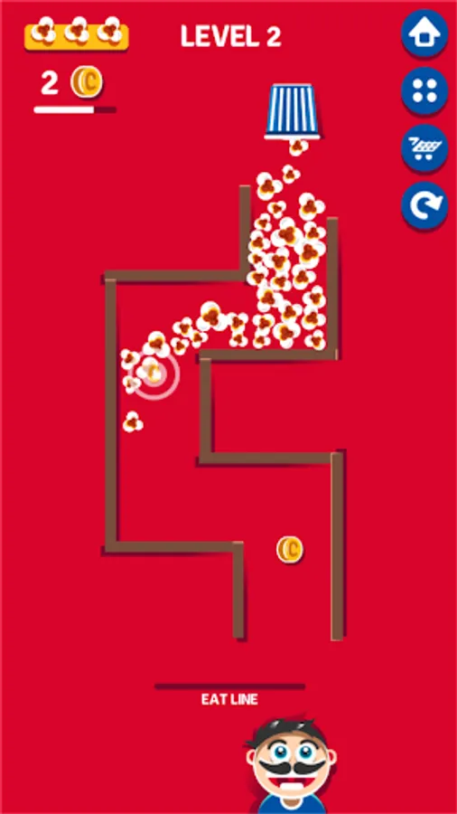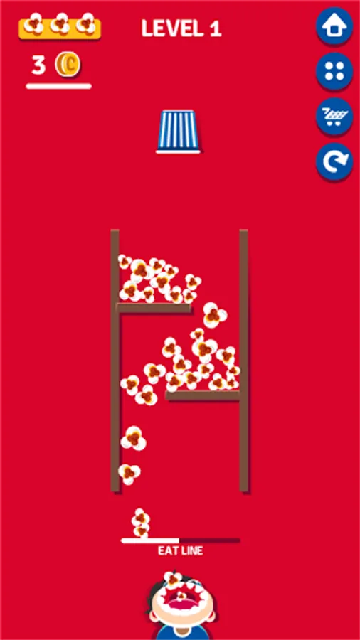 Complete the Level: Successfully deliver the popcorn to the popcorn eater's mouth, ensuring less than three pieces fall out, to complete each level and progress to the next.