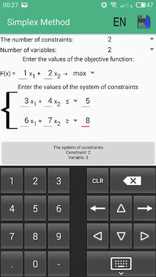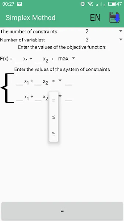 In this application, it is possible, very quickly, to solve the linear programming problems Simplex by the method WITHOUT INTERNET ACCESS. Also in the program a very convenient, understandable interface and solution is described in detail step by step