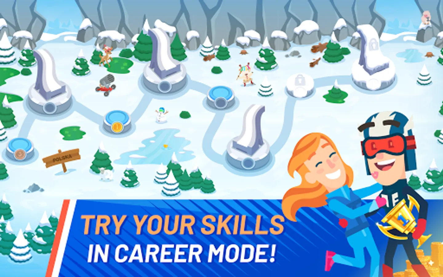- Compete on close to 90 ski jumping hills (with more coming soon) in career mode, unlock new countries and hills, spend your hard-earned money on fancy ski suits, skis and helmets!