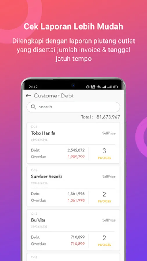 SimpliDOTS Monitoring facilitates sales managers / supervisors to monitor sales achievements & performance. You can easily check stock in your warehouse & your customer debt anywhere and anytime. Not only that, SimpliDOTS Monitoring also can track field operators such as sales, drivers, debt collectors in real time.